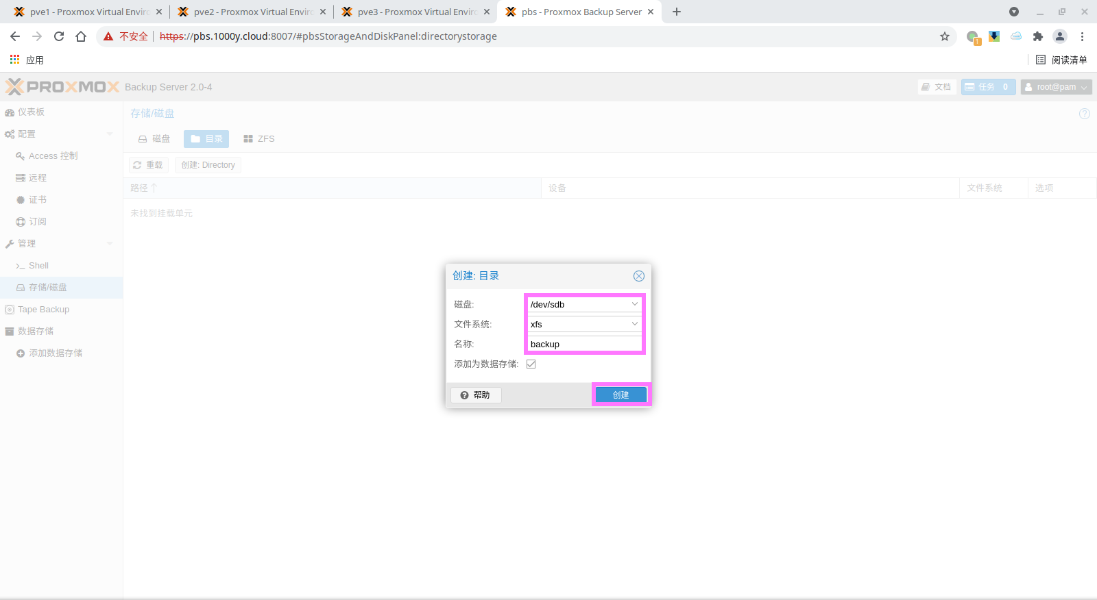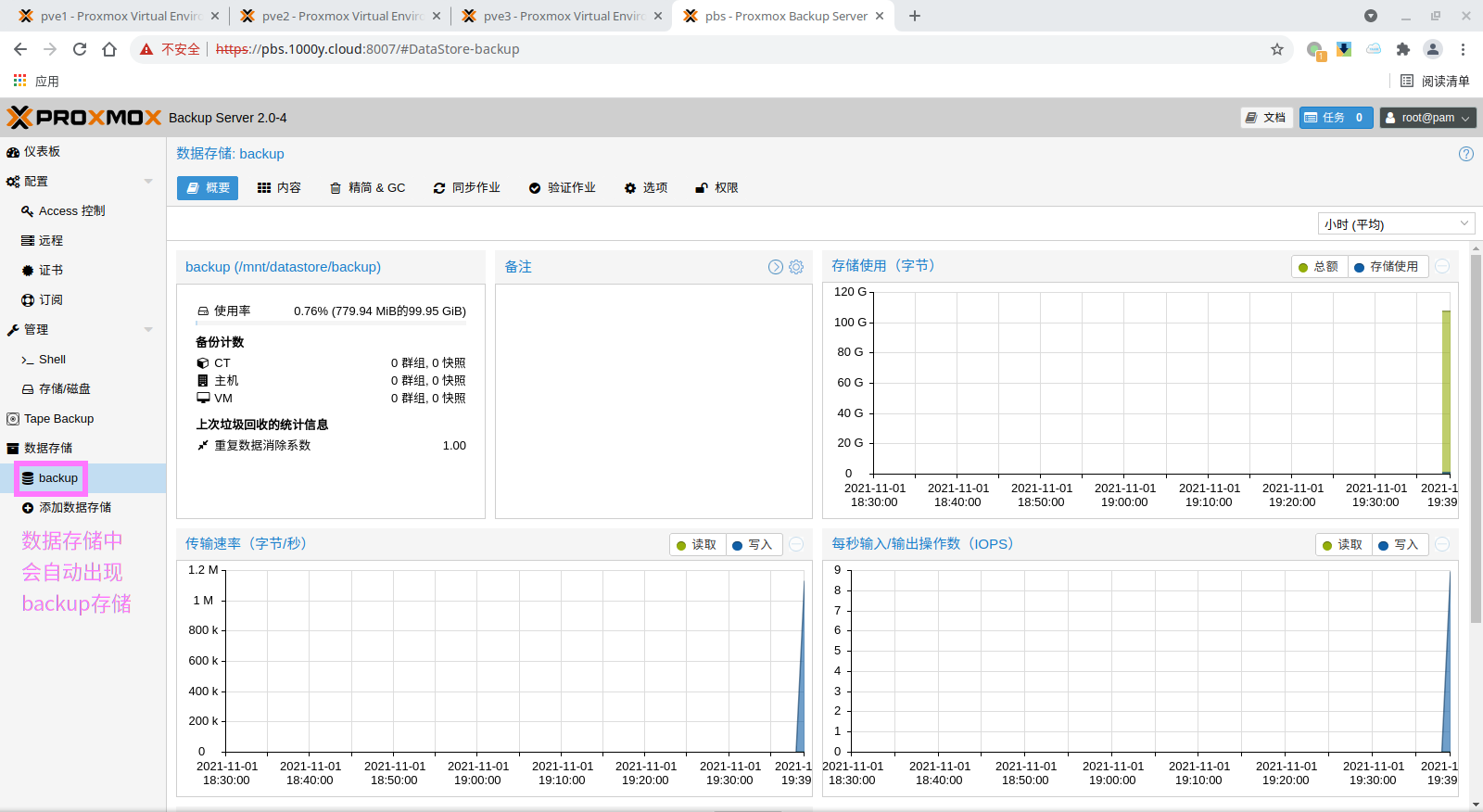 可在pbs命令行中确认data存储的挂载点 root@pbs:~# more /etc/proxmox-backup/datastore.cfg datastore: backup path /mnt/datastore/backup