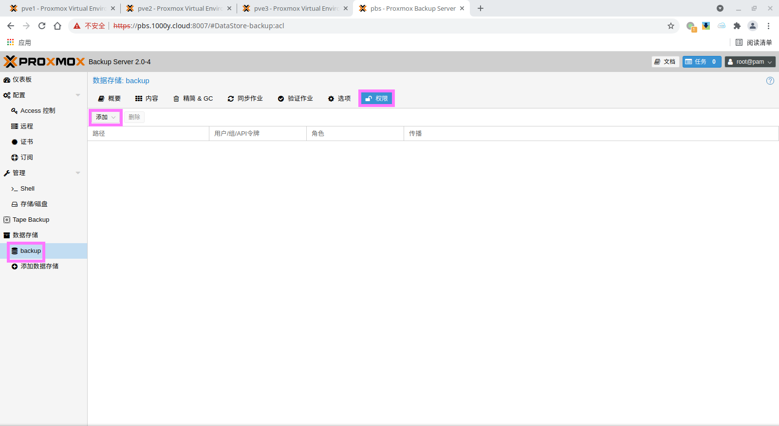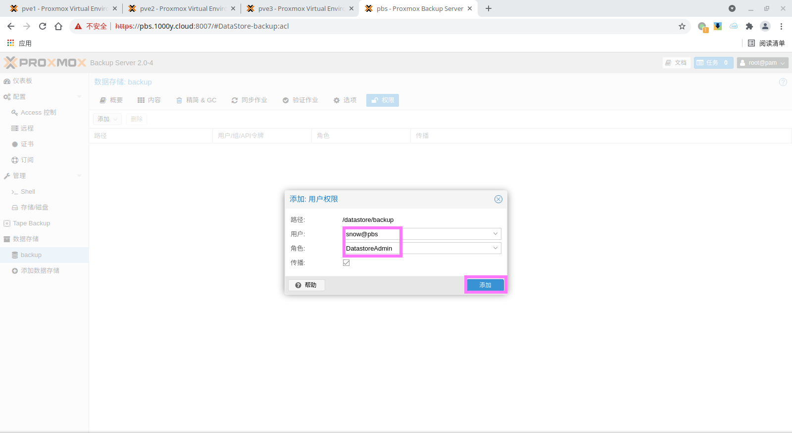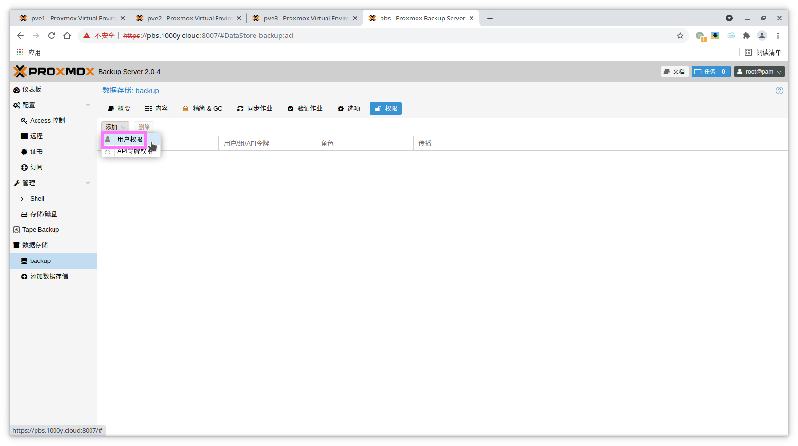 1) 为备份的存储空间授权账户 # PVE版本低于6.2-1请安装pbc客户端工具,如版本为6.2-1及以上版本则已自动安装完毕 root@pve:~# apt install proxmox-backup-client