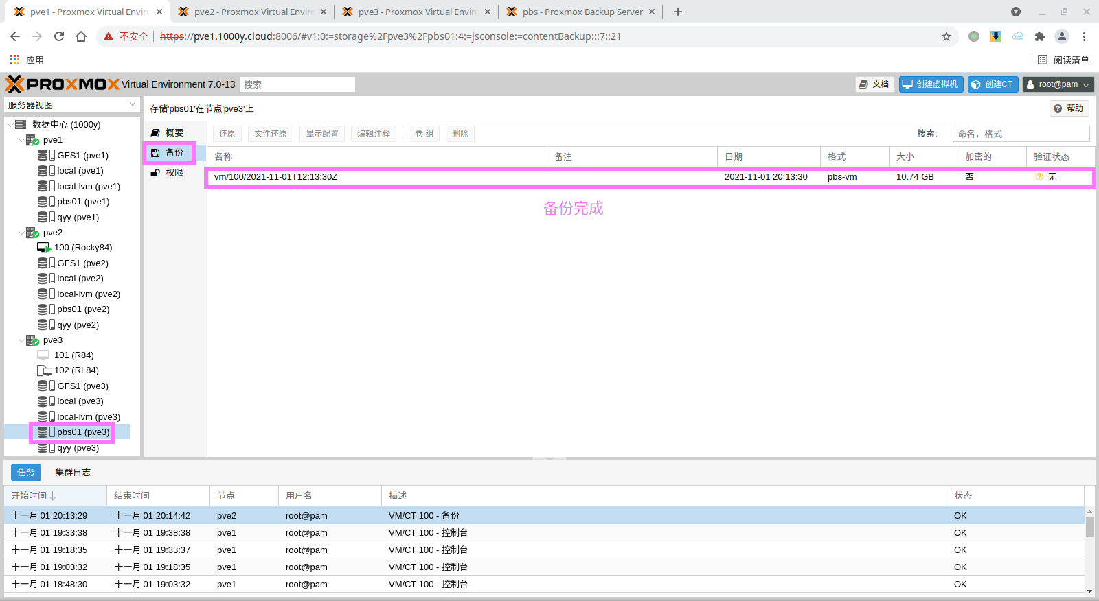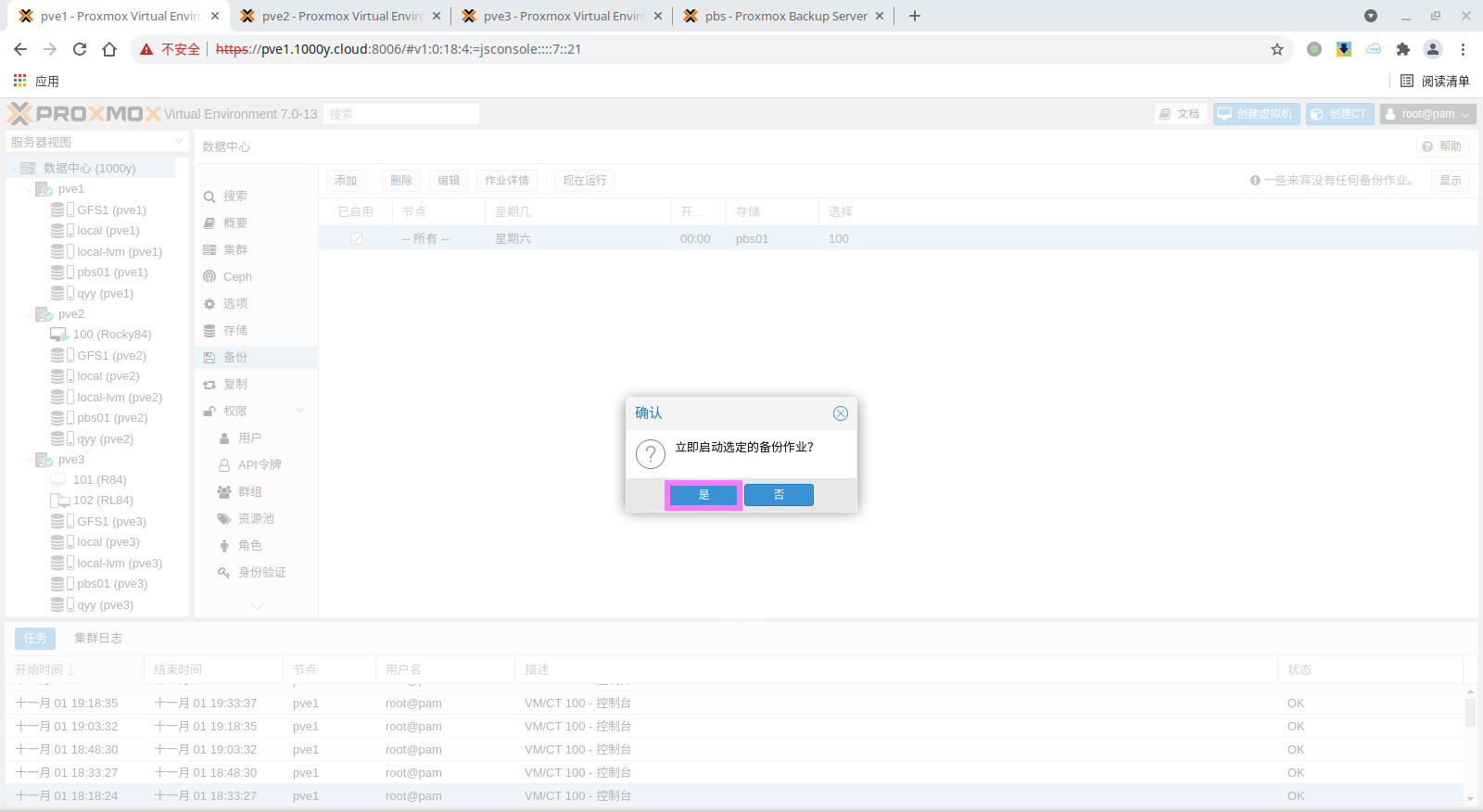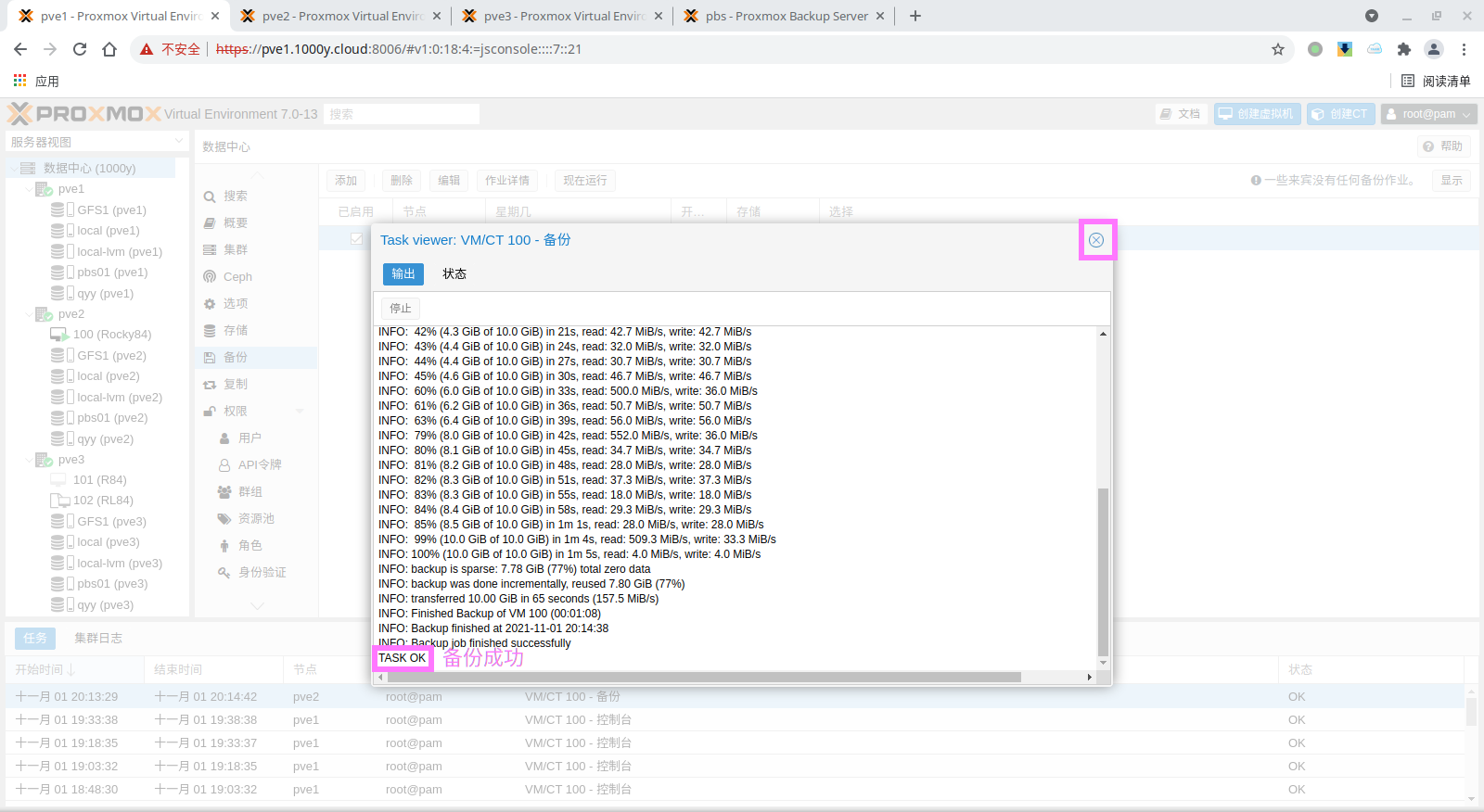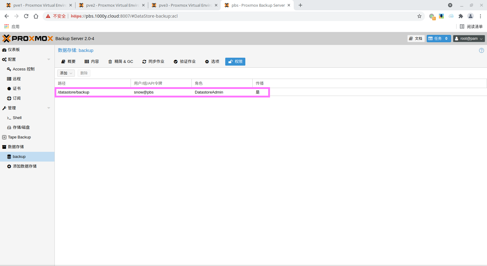 pbs: pbs01 datastore backup server pbs.1000y.cloud content backup fingerprint 47:9b:ac:2e:87:fa:f7:ff:b3:e4:71:51:38:23:a5:39:15:b4:34:b3:6b:36:81:52:09:59:0e:58:c5:7e:00:c1 prune-backups keep-all=1 username snow@pbs12.3 备份PVE的虚拟机