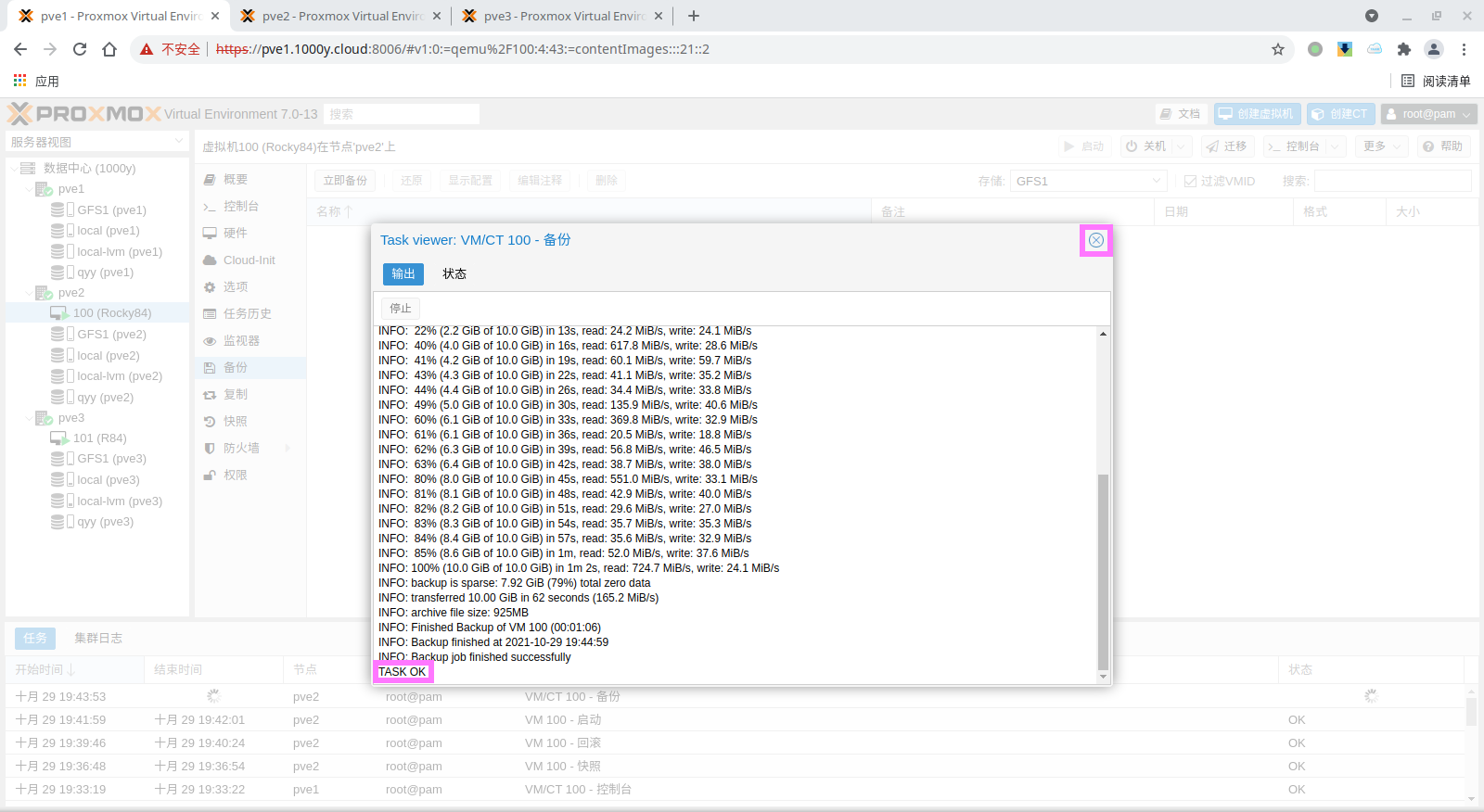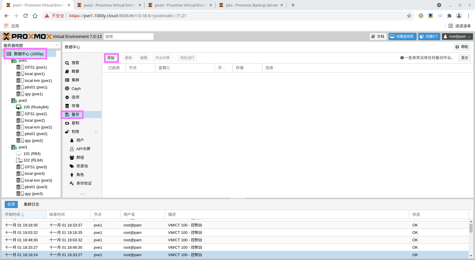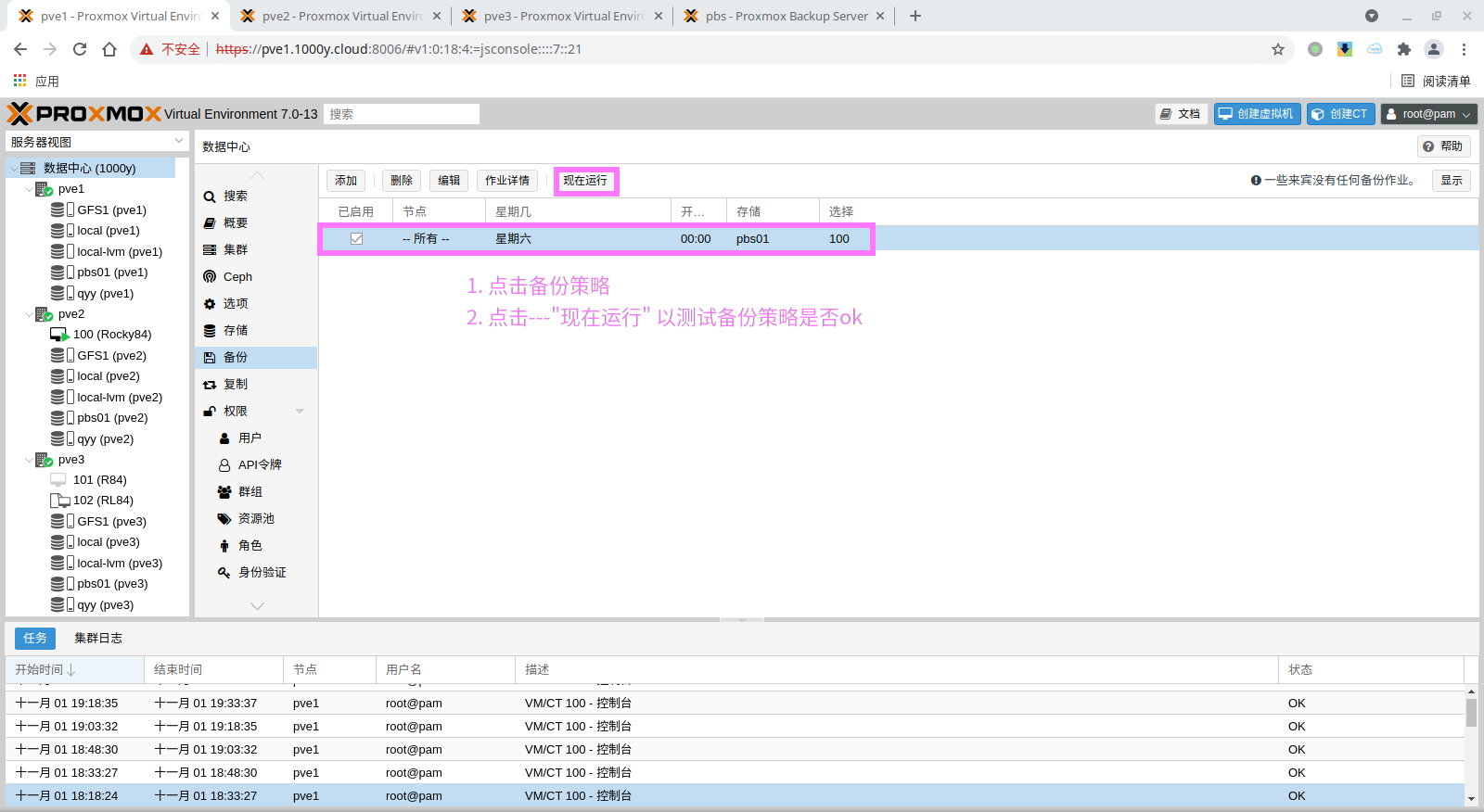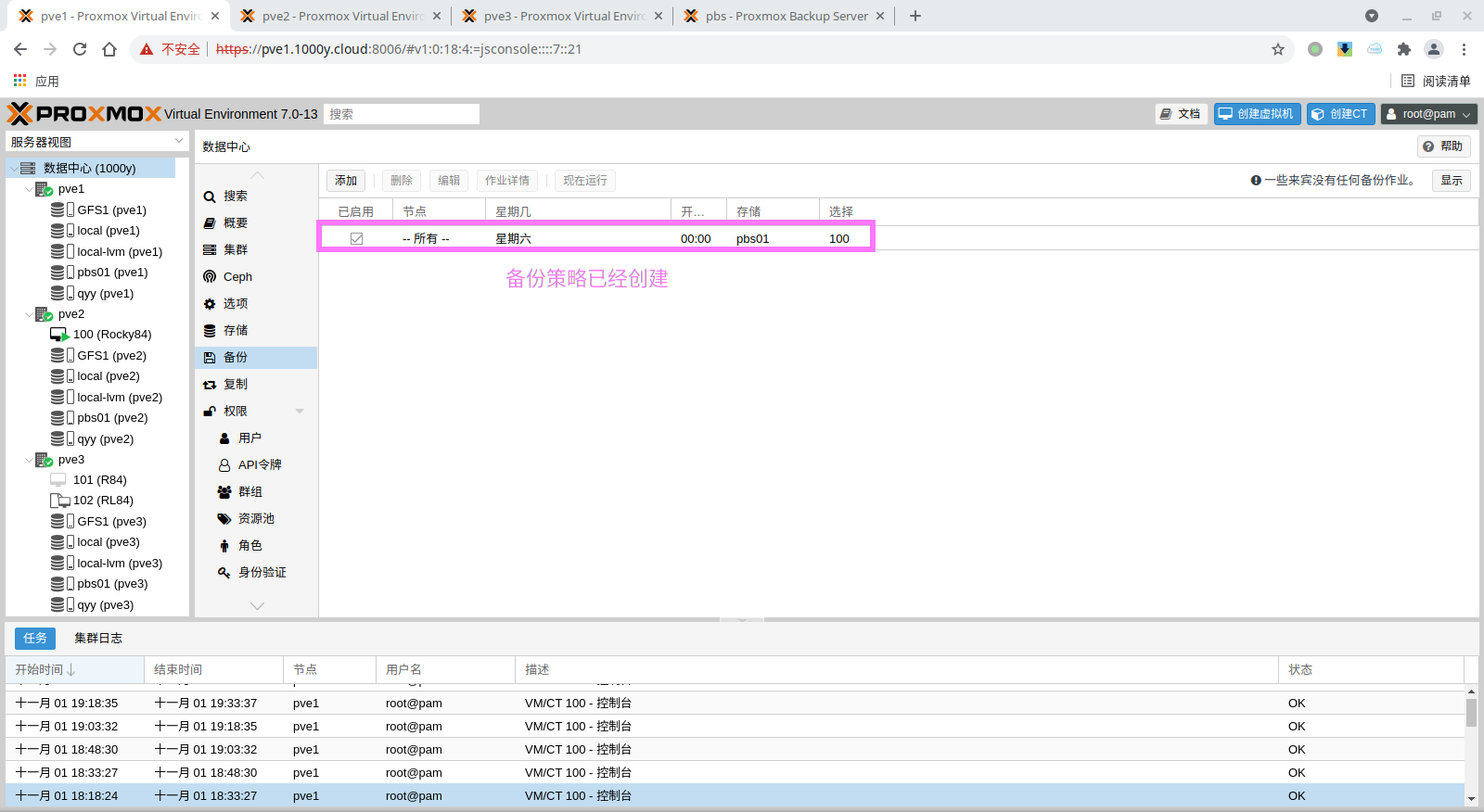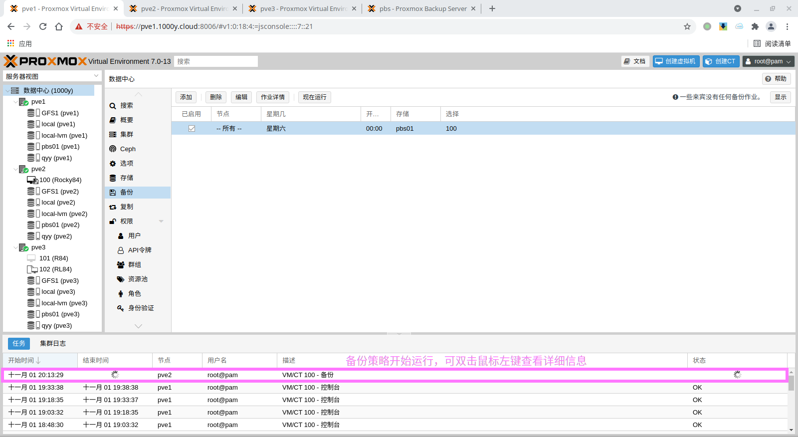 pbs: pbs01 datastore backup server pbs.1000y.cloud content backup fingerprint 47:9b:ac:2e:87:fa:f7:ff:b3:e4:71:51:38:23:a5:39:15:b4:34:b3:6b:36:81:52:09:59:0e:58:c5:7e:00:c1 prune-backups keep-all=1 username snow@pbs12.3 备份PVE的虚拟机