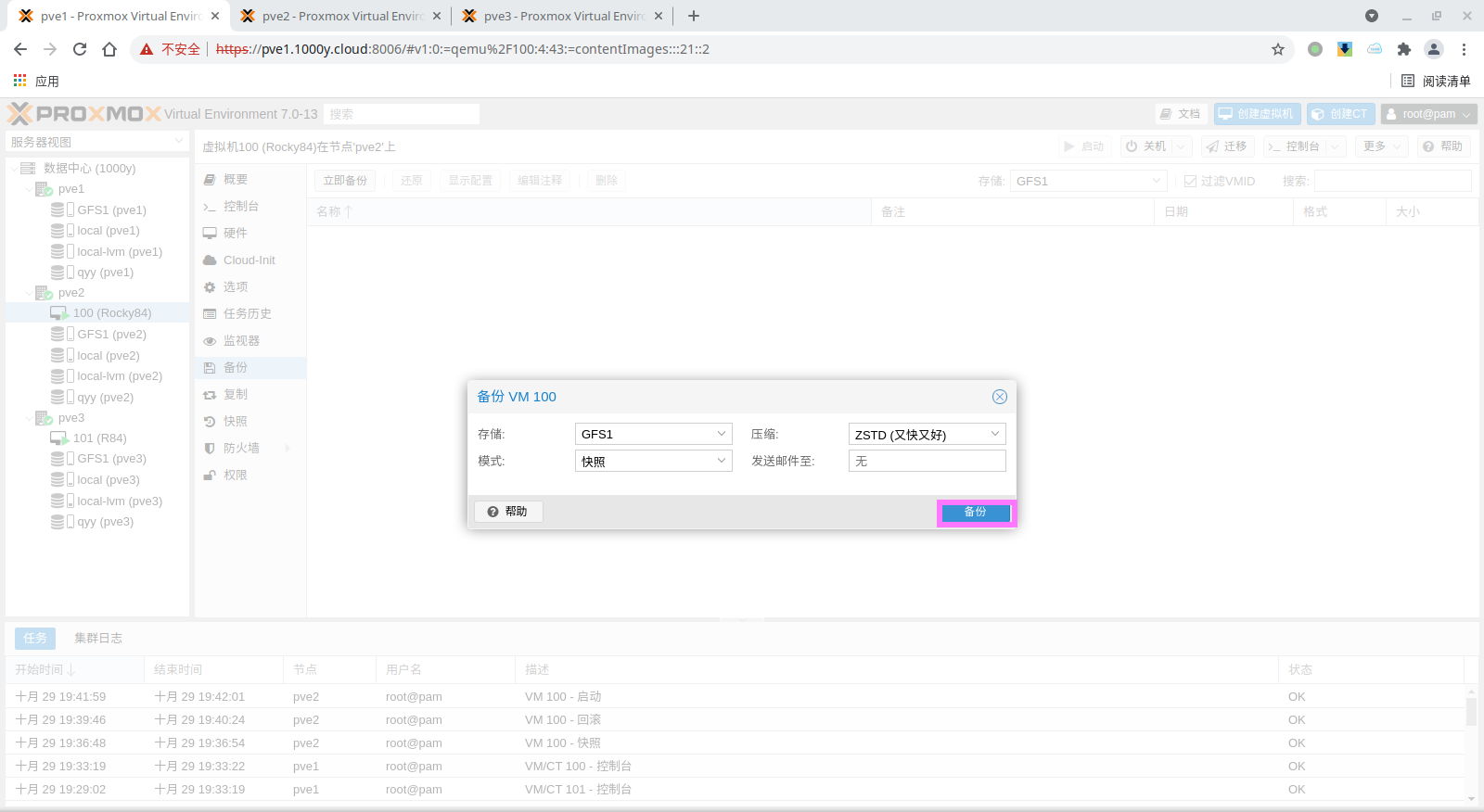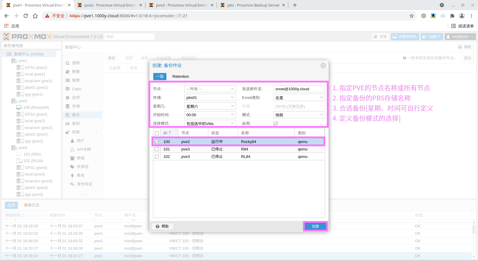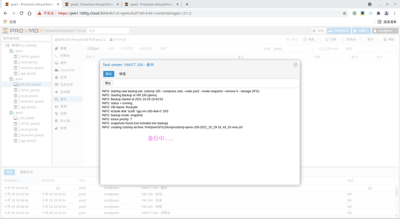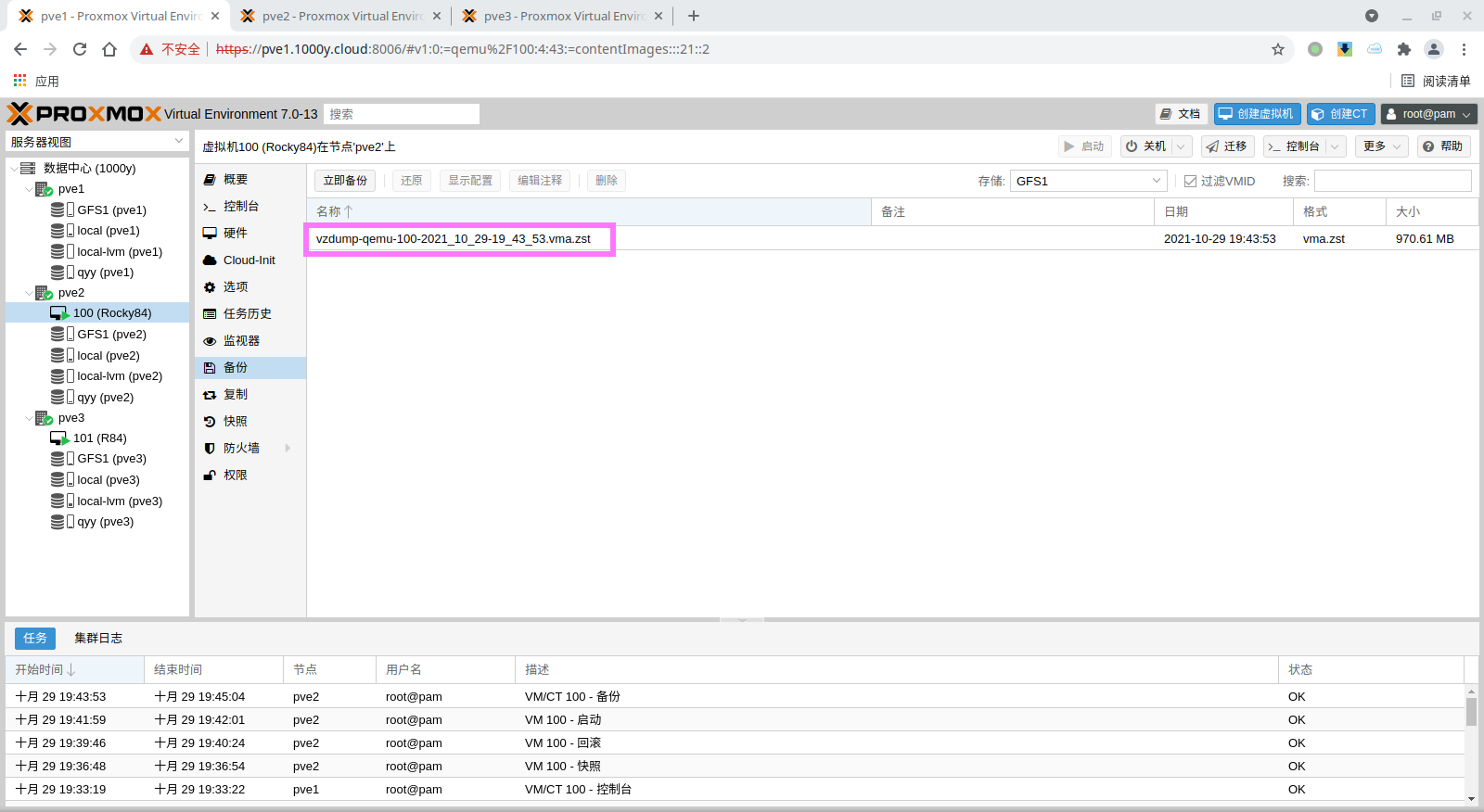 pbs: pbs01 datastore backup server pbs.1000y.cloud content backup fingerprint 47:9b:ac:2e:87:fa:f7:ff:b3:e4:71:51:38:23:a5:39:15:b4:34:b3:6b:36:81:52:09:59:0e:58:c5:7e:00:c1 prune-backups keep-all=1 username snow@pbs12.3 备份PVE的虚拟机