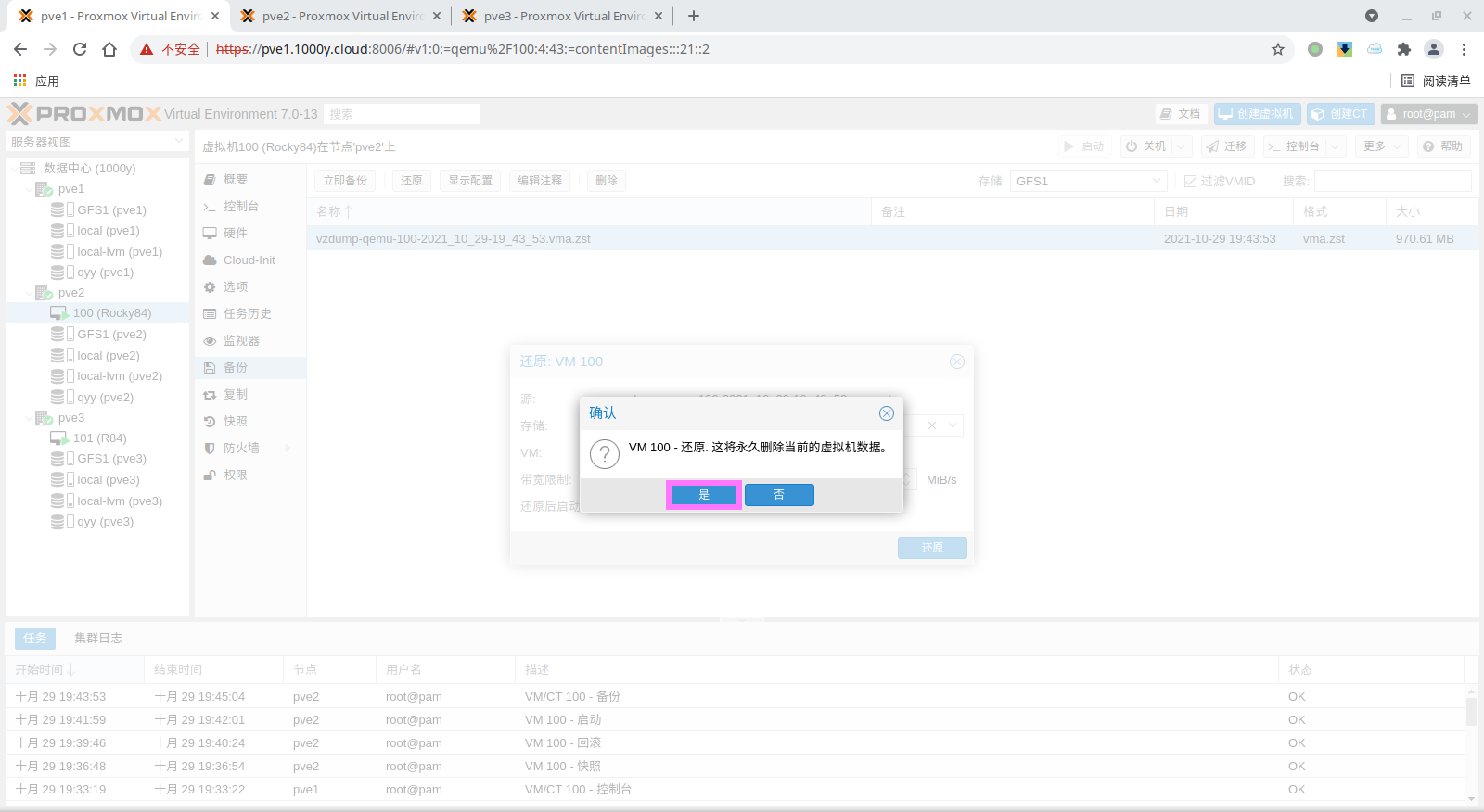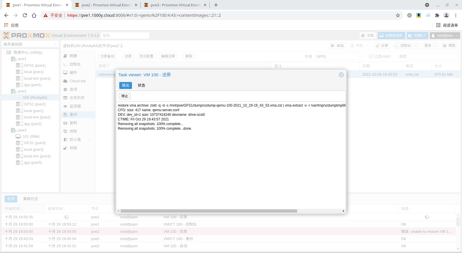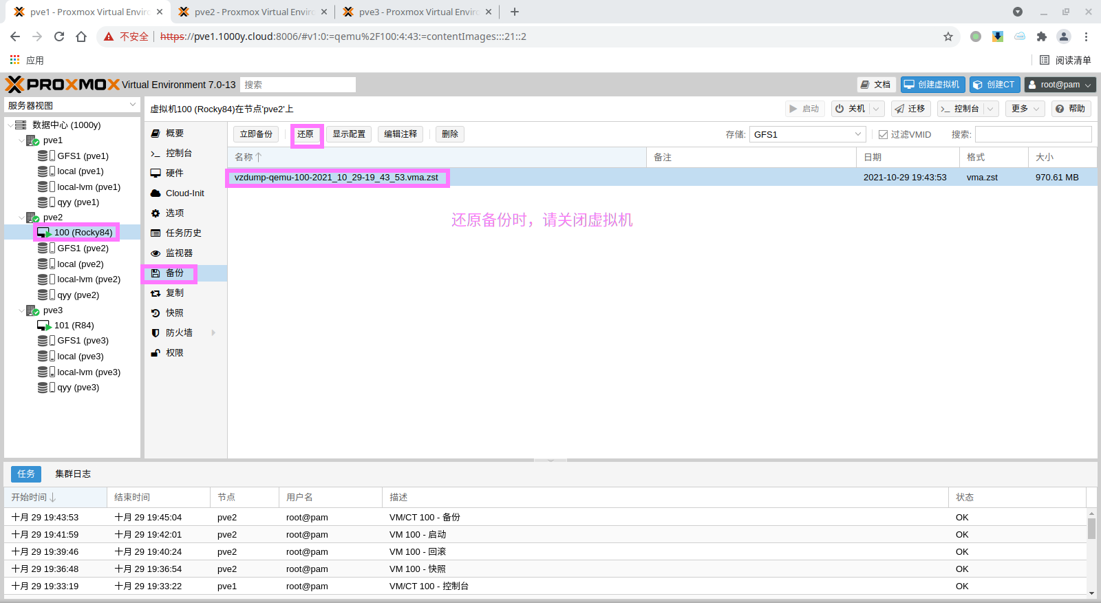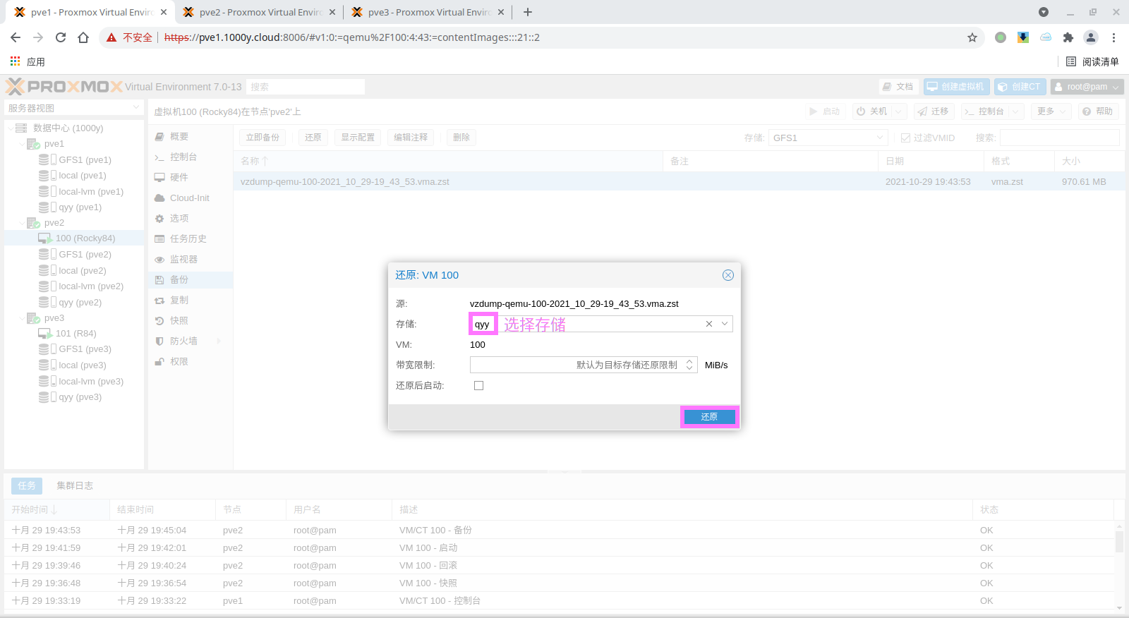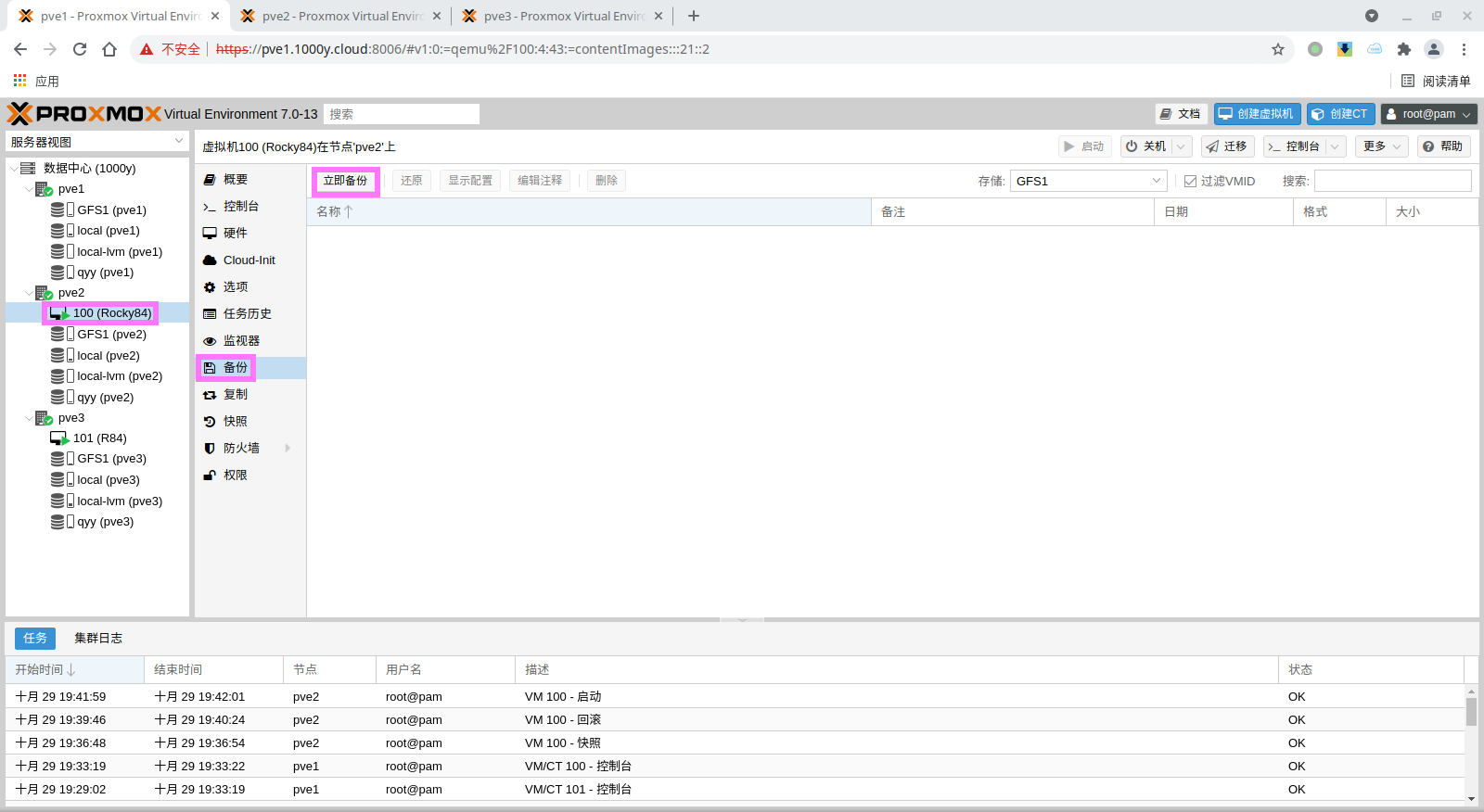 pbs: pbs01 datastore backup server pbs.1000y.cloud content backup fingerprint 47:9b:ac:2e:87:fa:f7:ff:b3:e4:71:51:38:23:a5:39:15:b4:34:b3:6b:36:81:52:09:59:0e:58:c5:7e:00:c1 prune-backups keep-all=1 username snow@pbs12.3 备份PVE的虚拟机