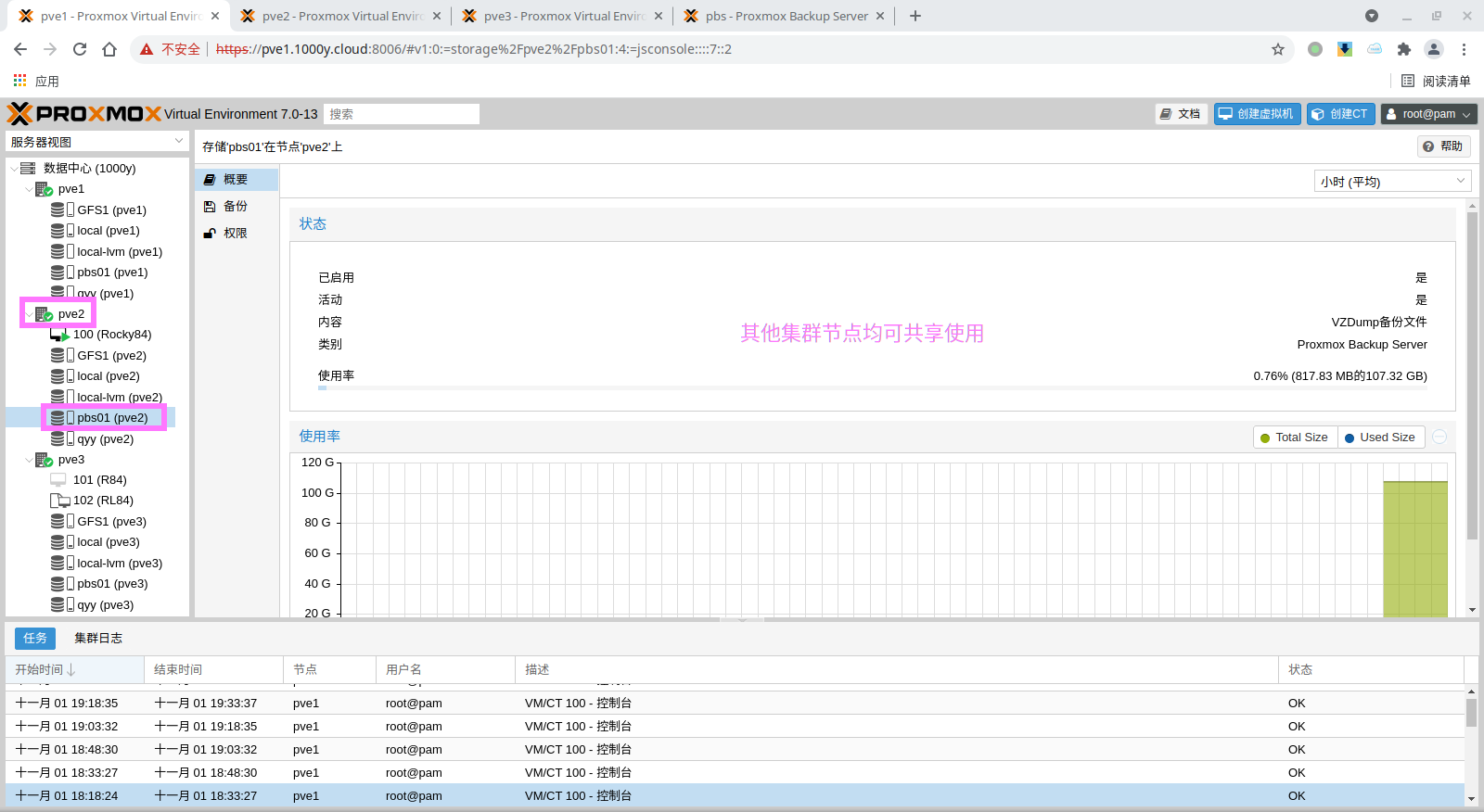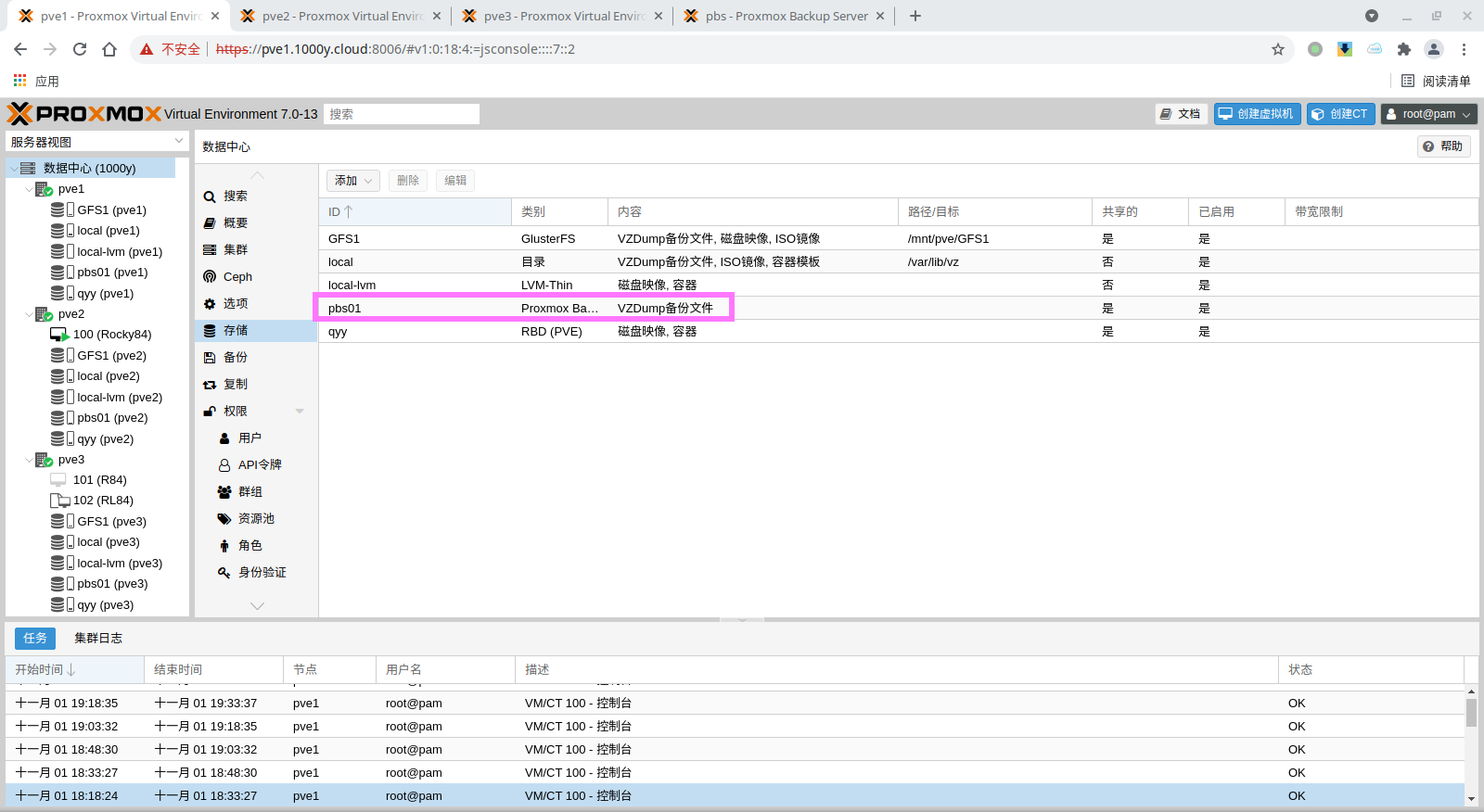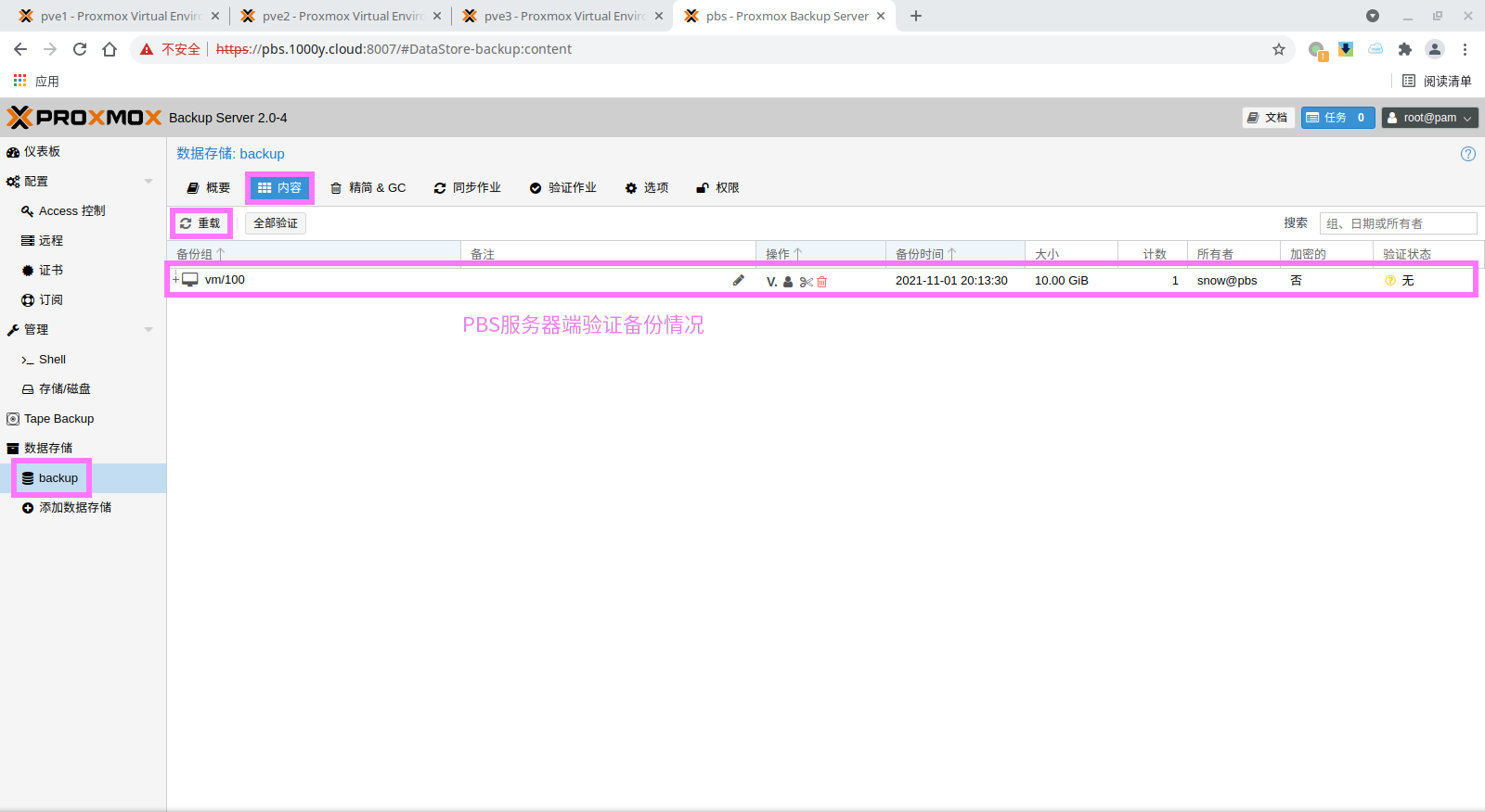 3) 验证PBS客户端与服务器端连接的正确性验证 root@pve1:~# cat /etc/pve/storage.cfg dir: local path /var/lib/vz content iso,vztmpl,backup