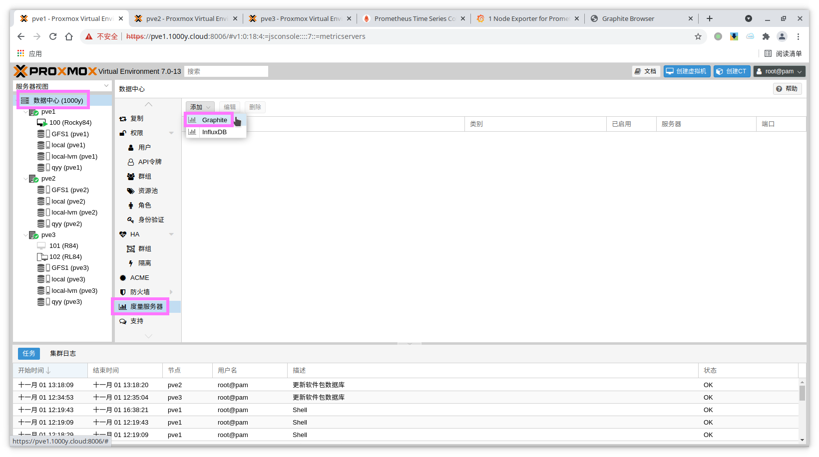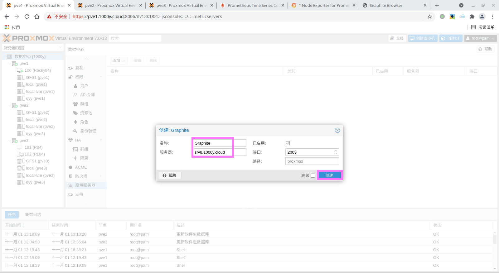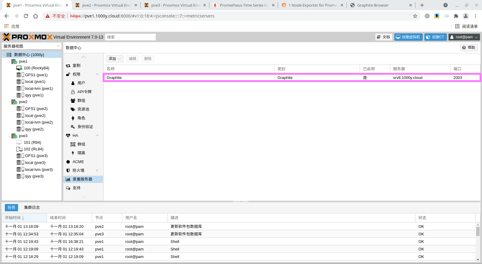 3) 在素有的PVE主机节点行安装promox-pve-exportter (1) 创建Prometheus账户 root@pve1:~# groupadd --system prometheus root@pve1:~# useradd -s /sbin/nologin --system -g prometheus prometheus root@pve1:~# mkdir /etc/prometheus/