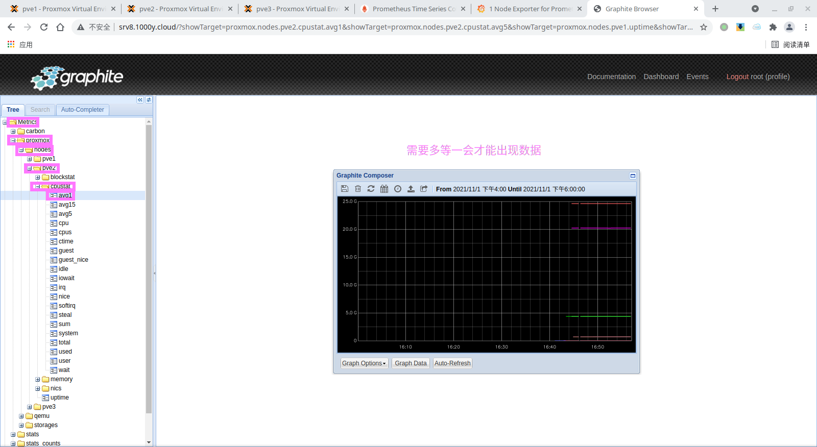 2) 使Graphite接收UDP请求---Proxmox默认使用udp发送计量数据 [root@srv8 ~]# vim /data/graphite/conf/carbon.conf ...... ...... # 修改103行的值 ENABLE_UDP_LISTENER = True UDP_RECEIVER_INTERFACE = 0.0.0.0 UDP_RECEIVER_PORT = 2003 ...... ......