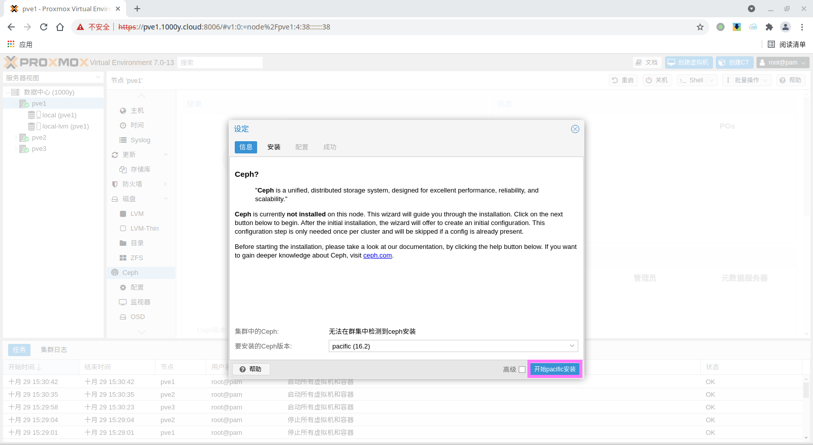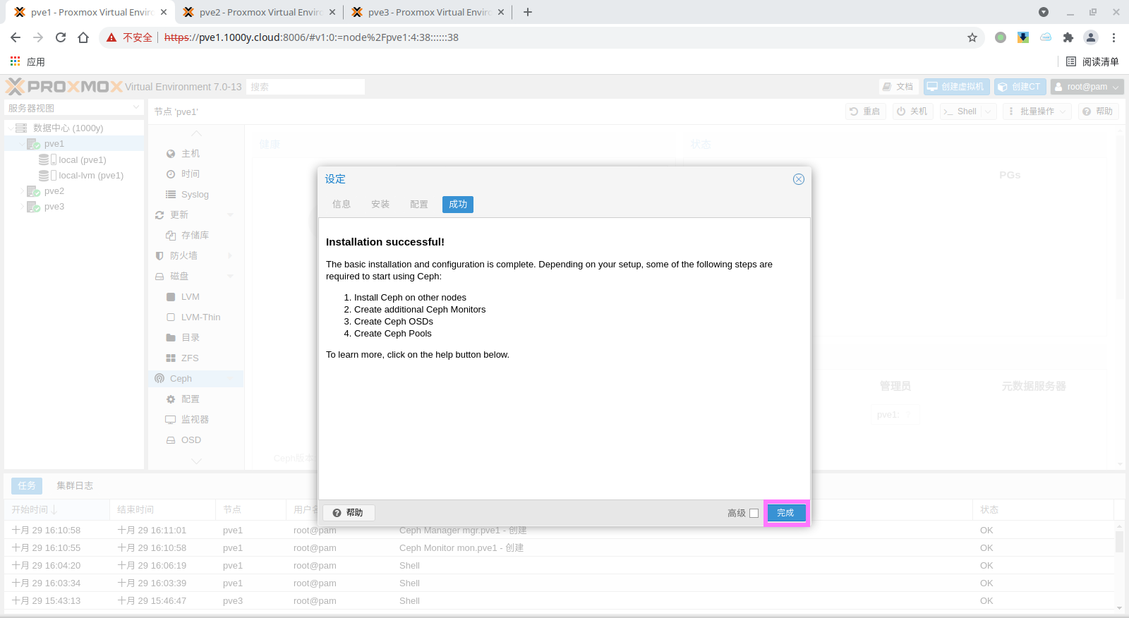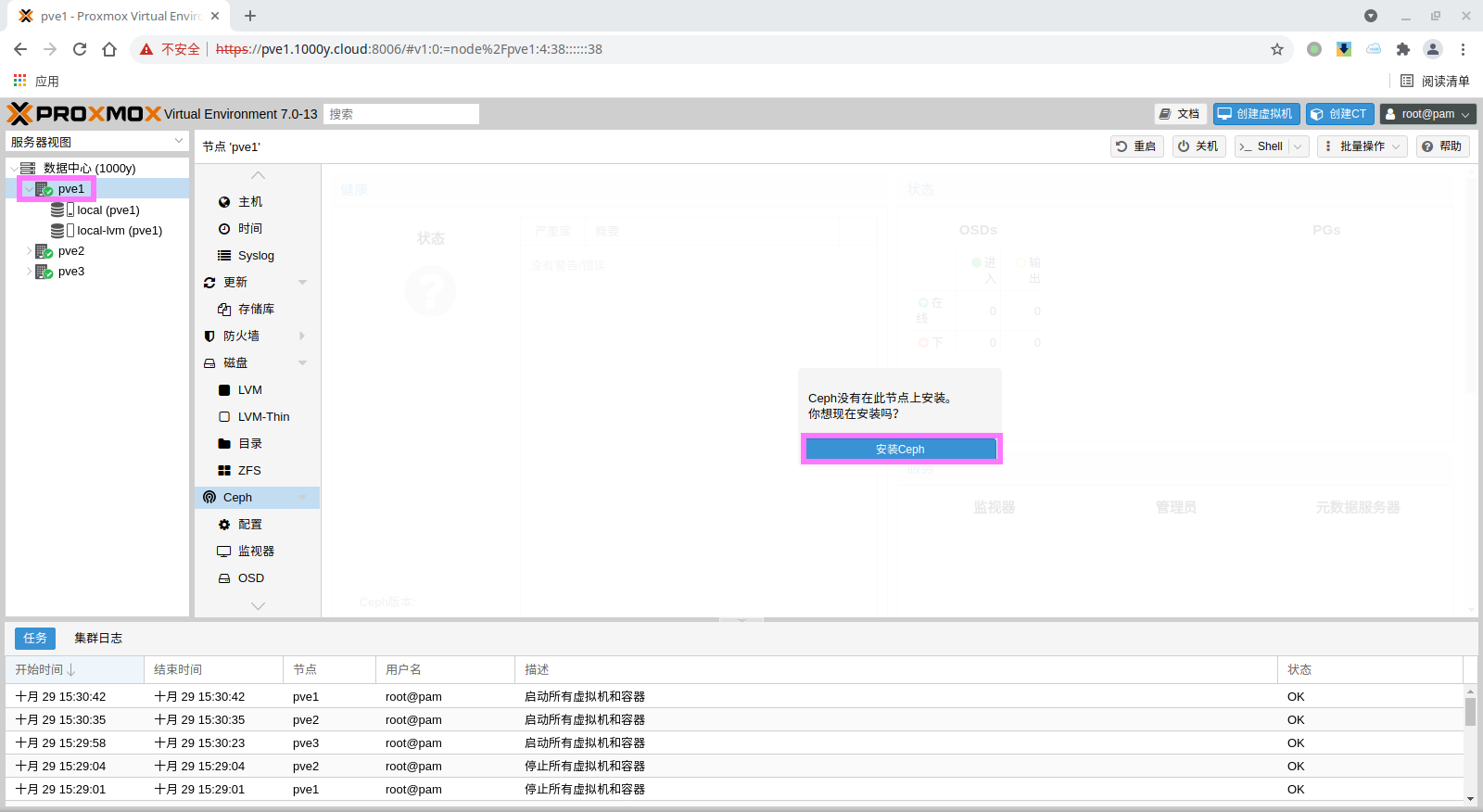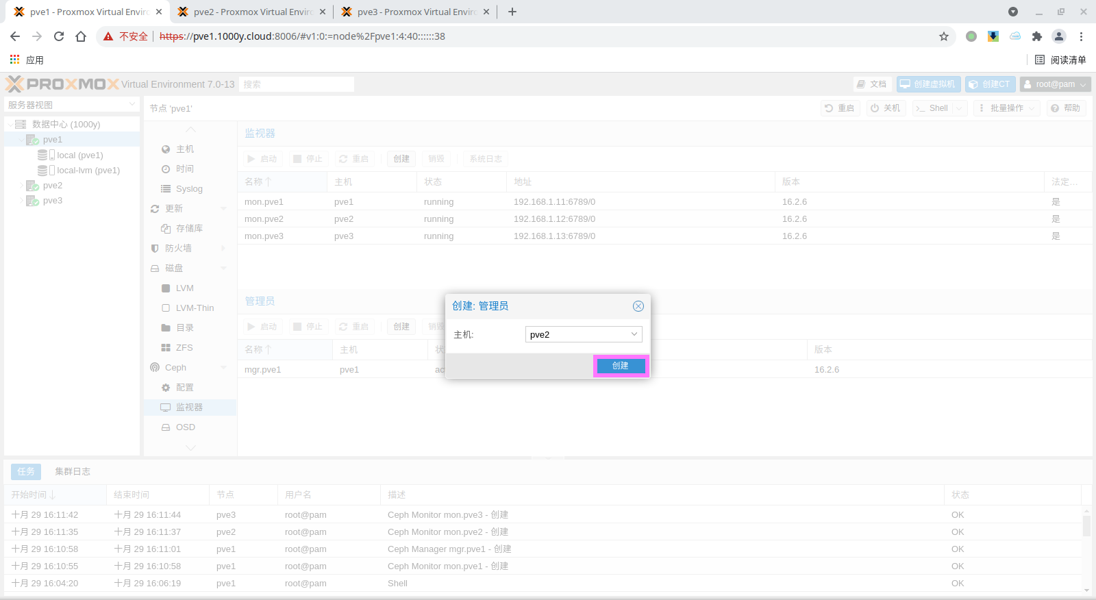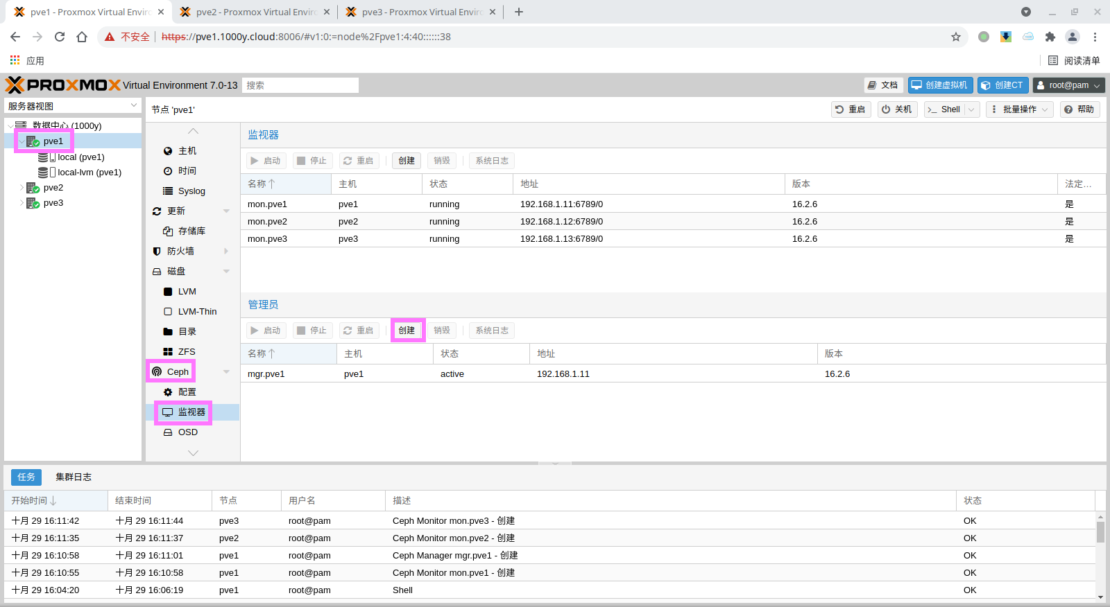 1) 所有主机均安装chrony服务(NTP Service) root@pve1:~# timedatectl set-timezone Asia/Shanghai root@pve1:~# apt install chrony -y root@pve1:~# systemctl enable --now chrony |