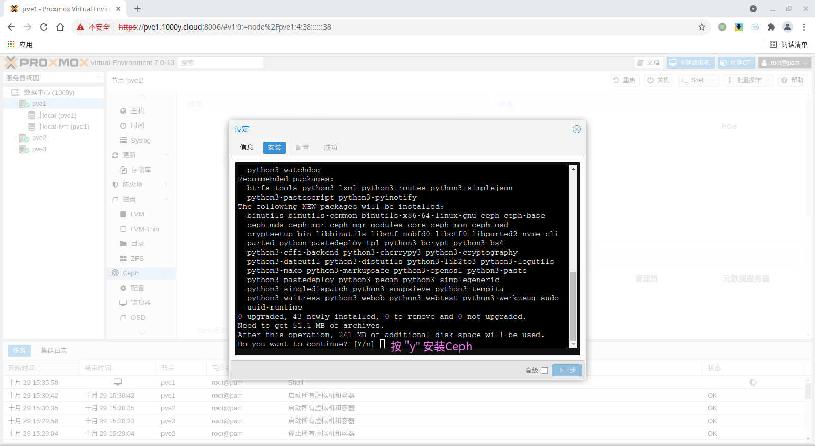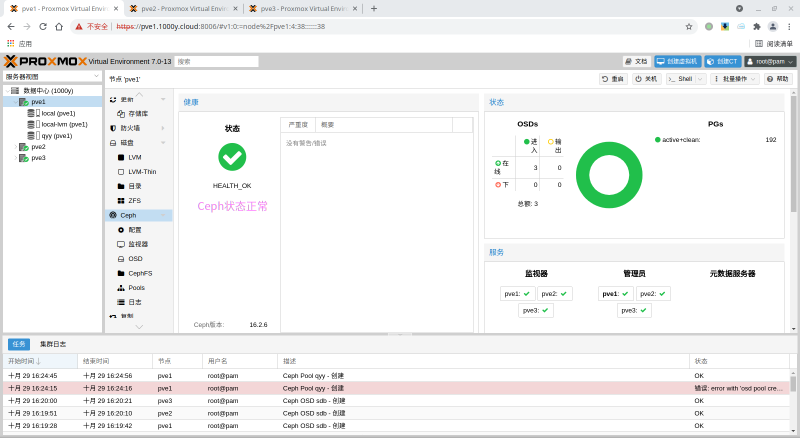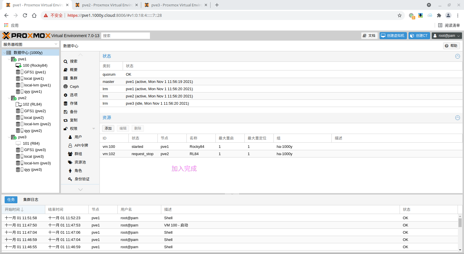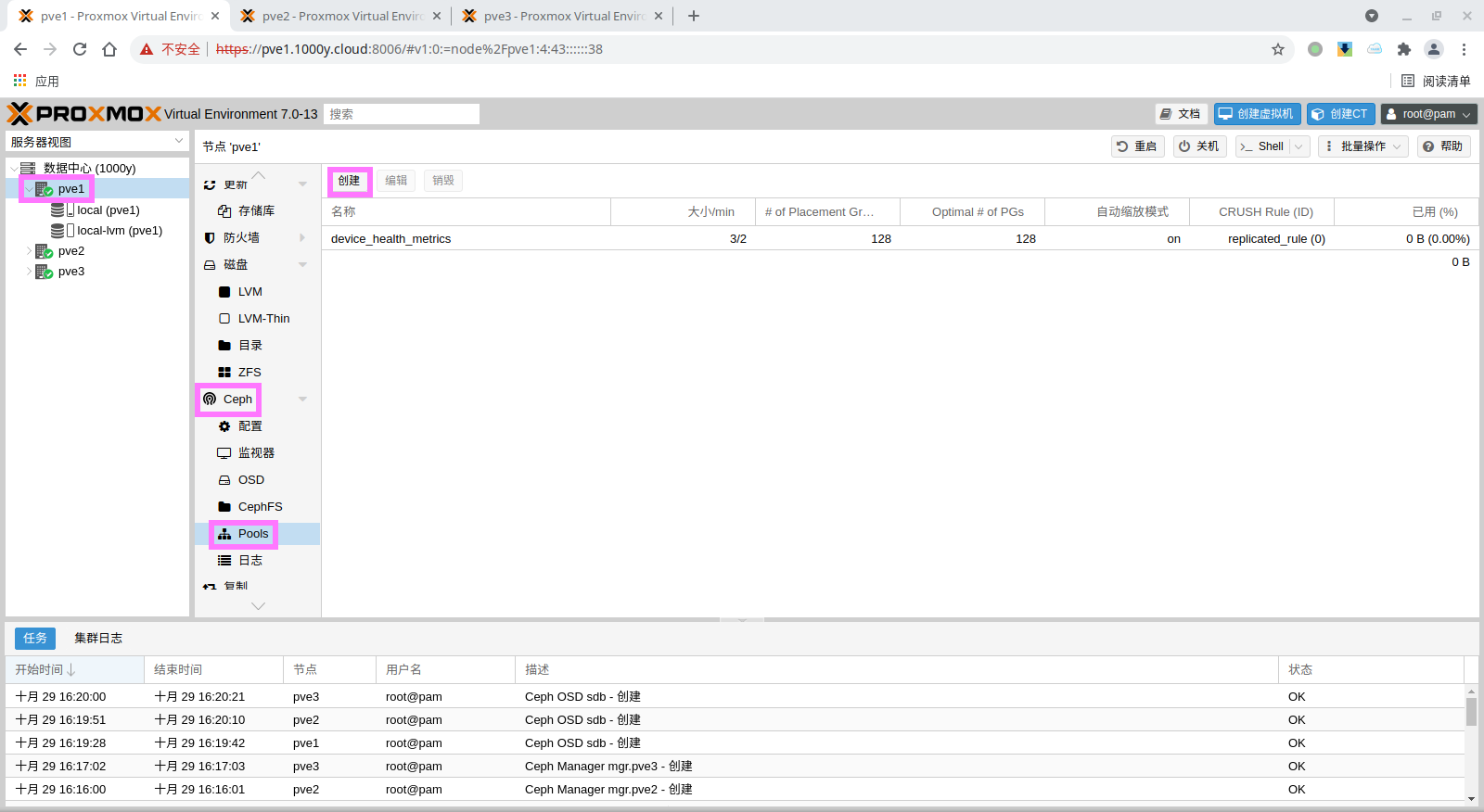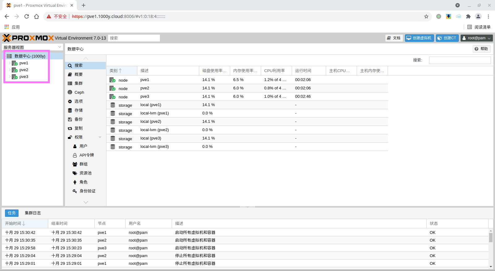 1) 所有主机均安装chrony服务(NTP Service) root@pve1:~# timedatectl set-timezone Asia/Shanghai root@pve1:~# apt install chrony -y root@pve1:~# systemctl enable --now chrony |