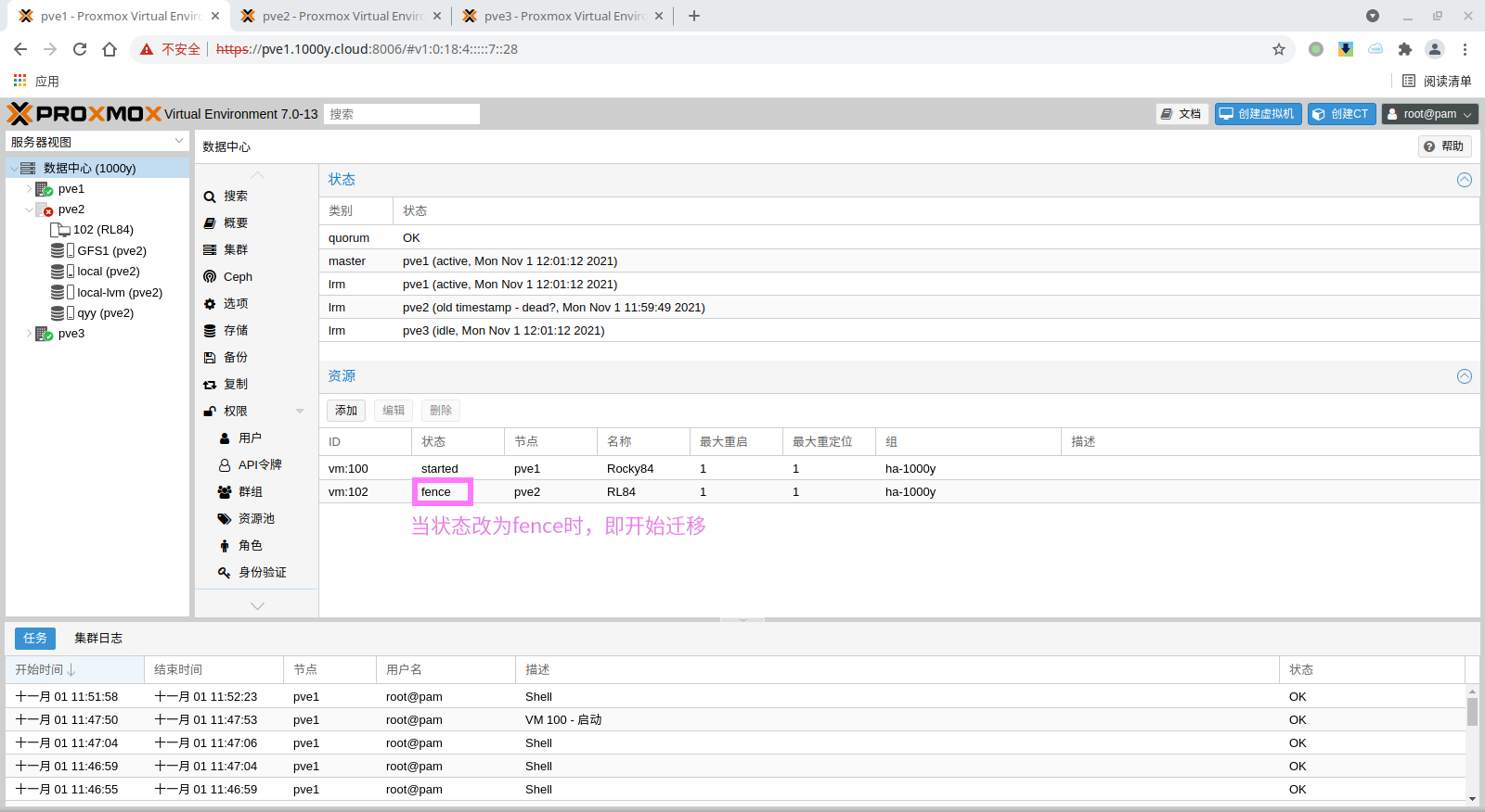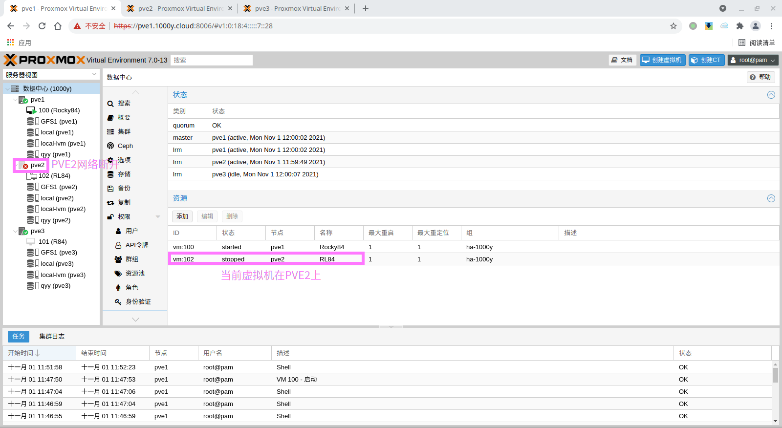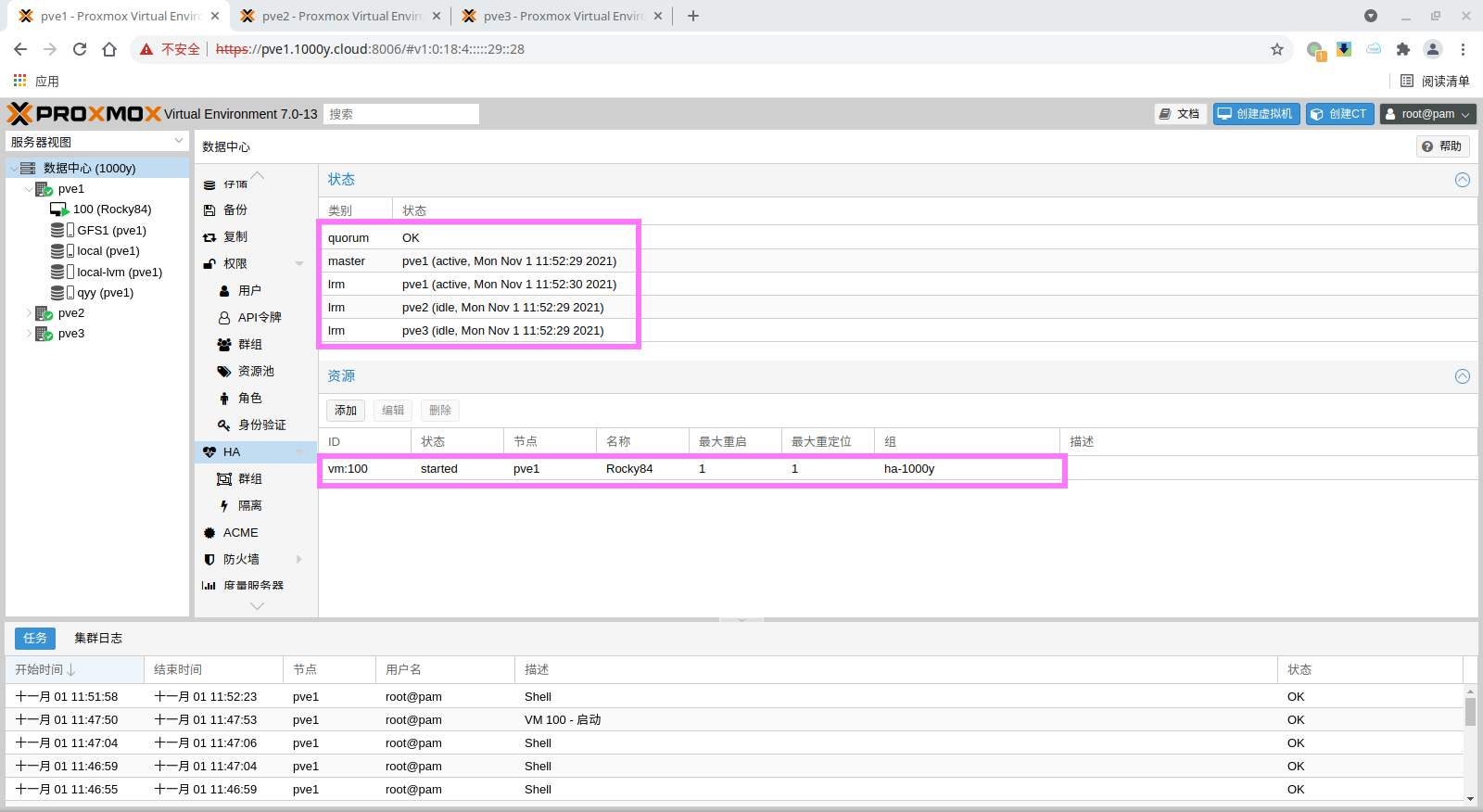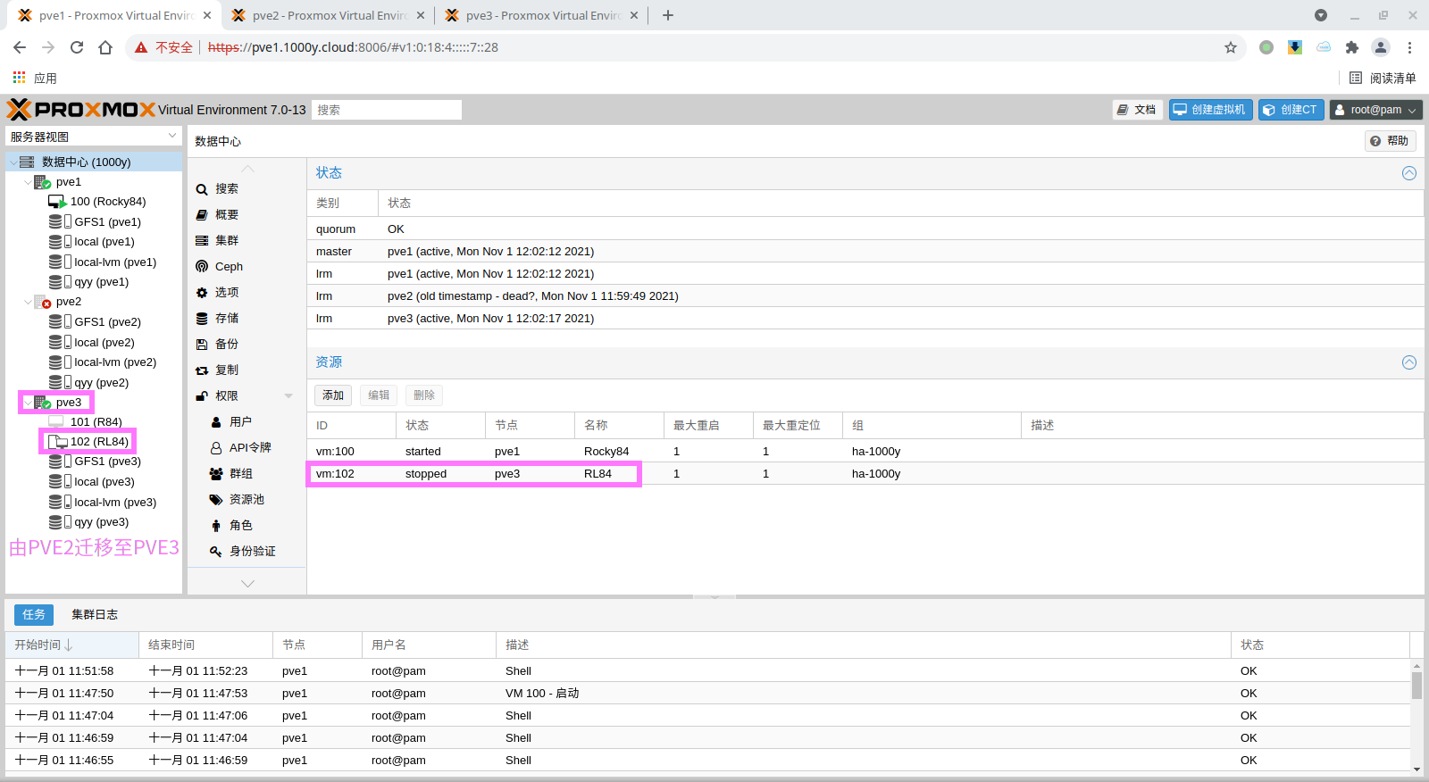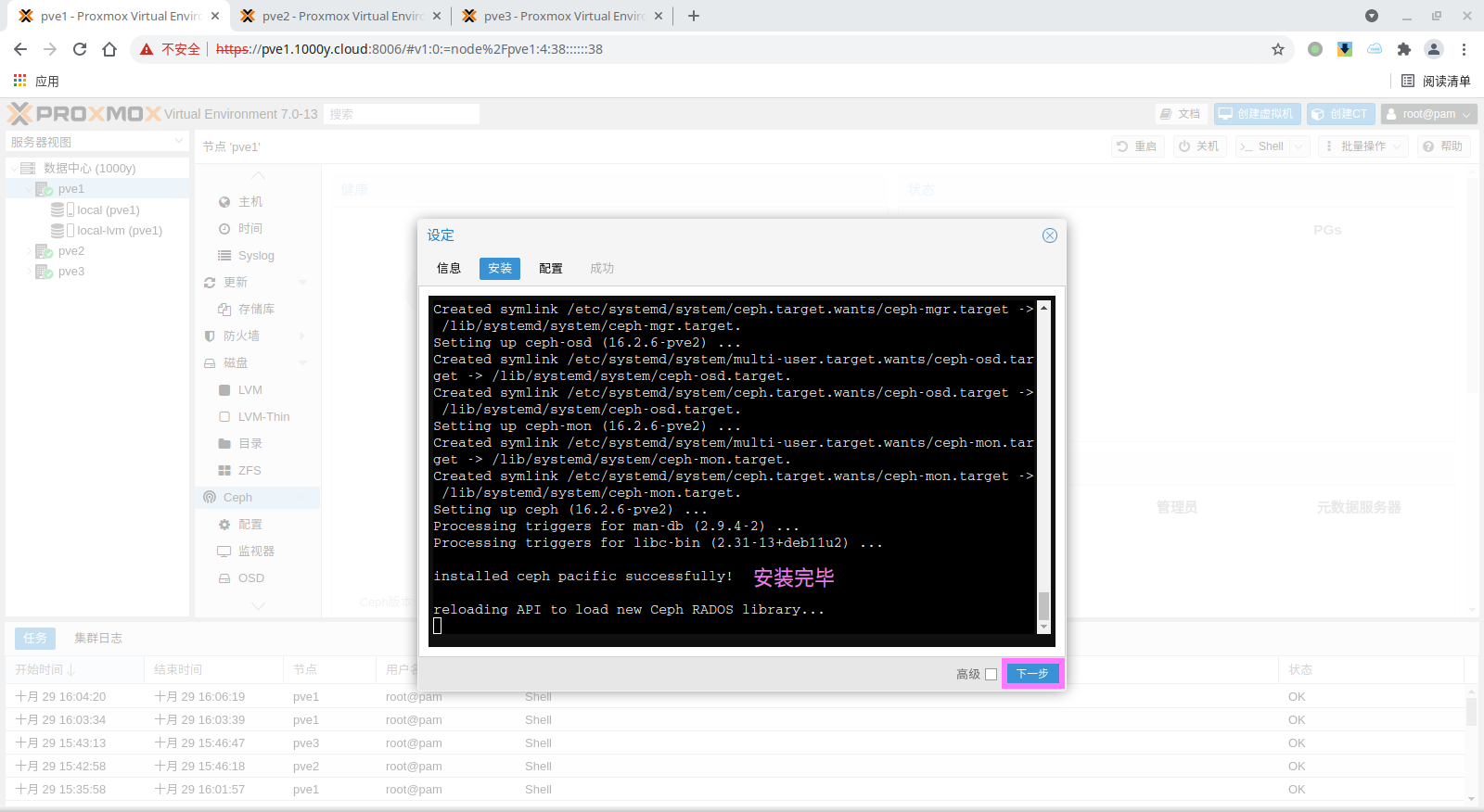 1) 所有主机均安装chrony服务(NTP Service) root@pve1:~# timedatectl set-timezone Asia/Shanghai root@pve1:~# apt install chrony -y root@pve1:~# systemctl enable --now chrony |