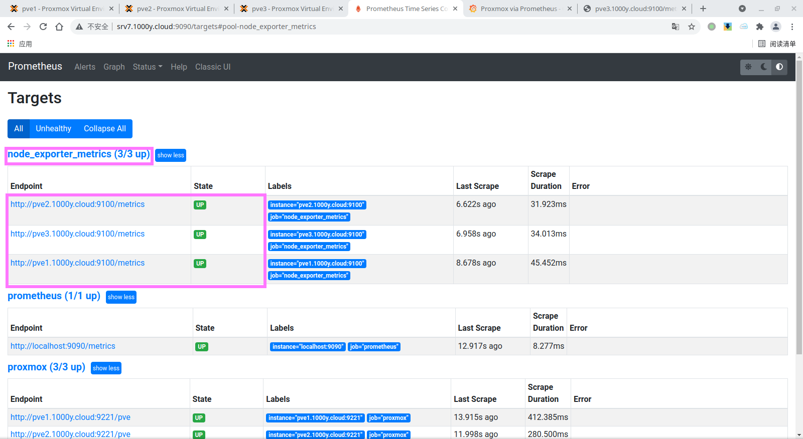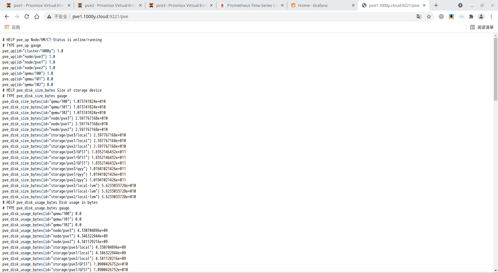 - job_name: 'proxmox' metrics_path: /pve static_configs: - targets: ['pve1.1000y.cloud:9221', 'pve2.1000y.cloud:9221', 'pve3.1000y.cloud:9221']