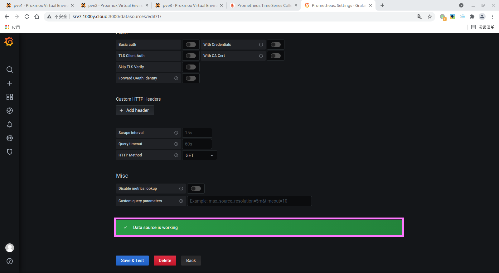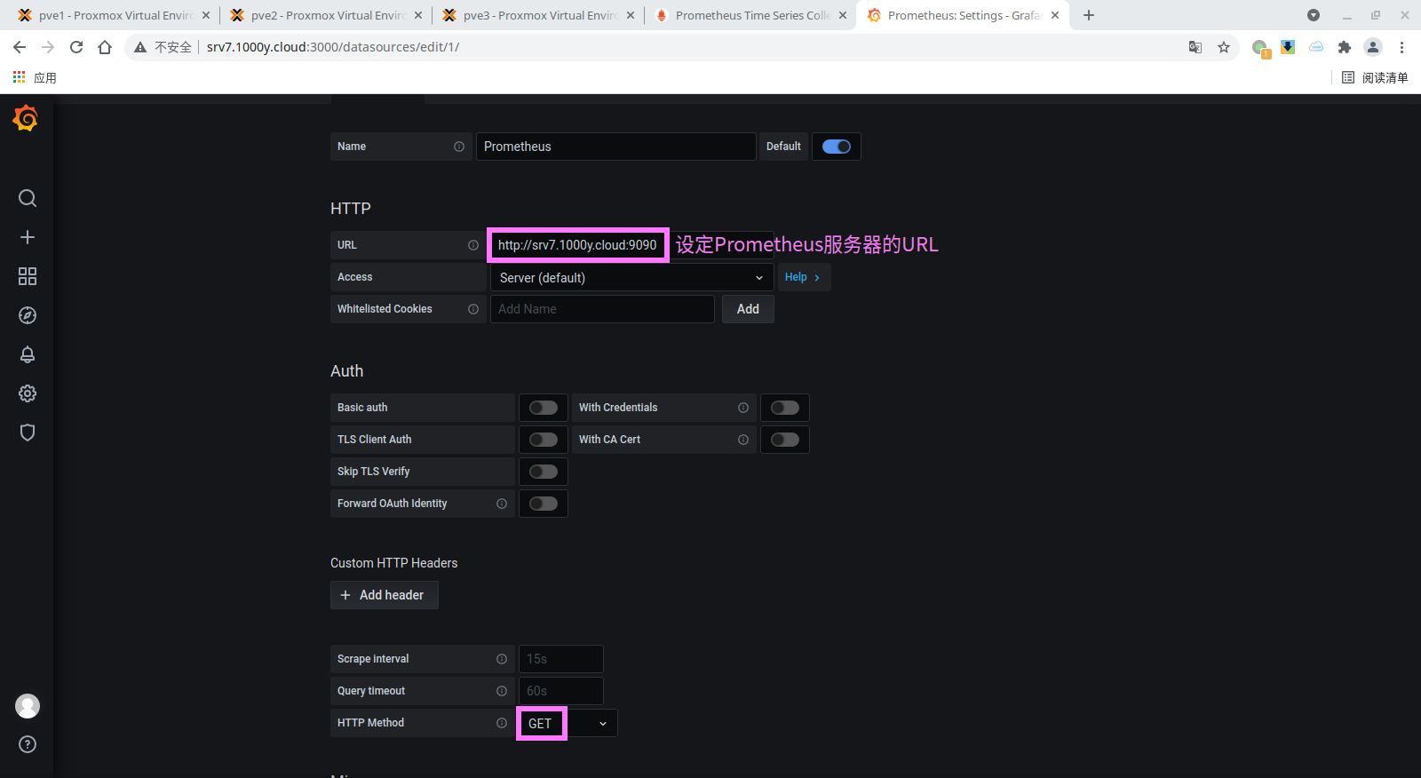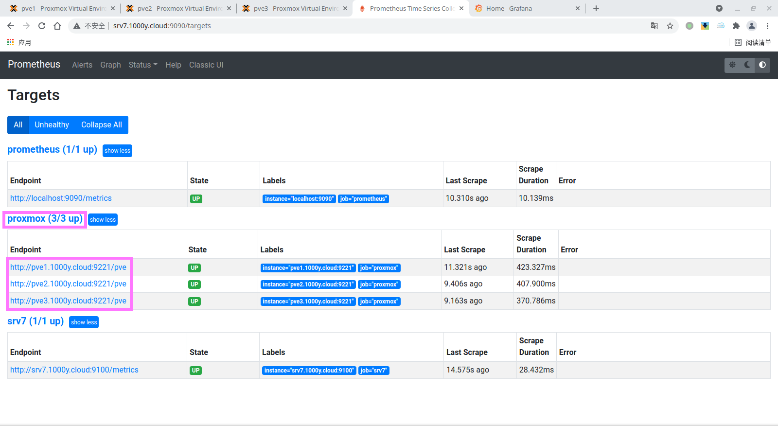 4) 将proxmox-pve-exporter加入至Prometheus [root@srv7 ~]# vim /etc/prometheus/prometheus.yml # 于文档最后追加如下内容 ...... ...... - job_name: "srv7" static_configs: - targets: ['srv7.1000y.cloud:9100']