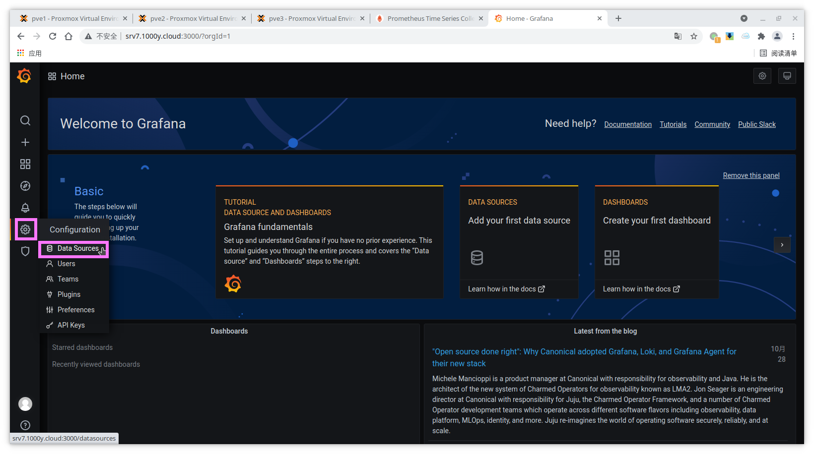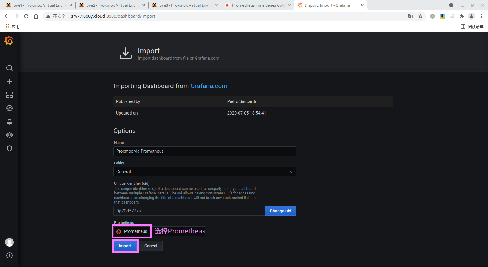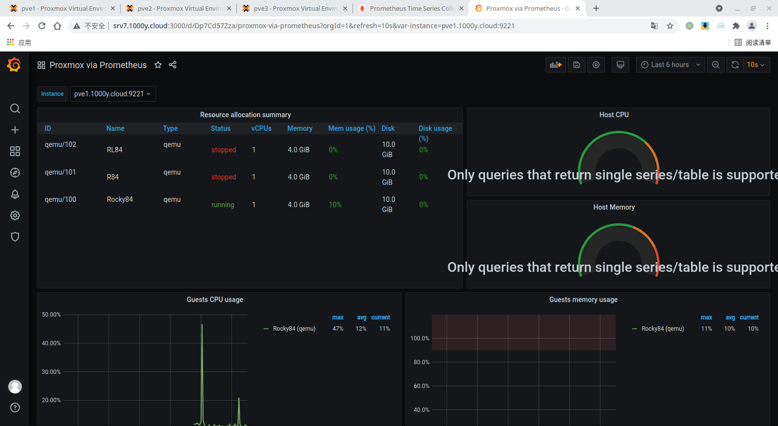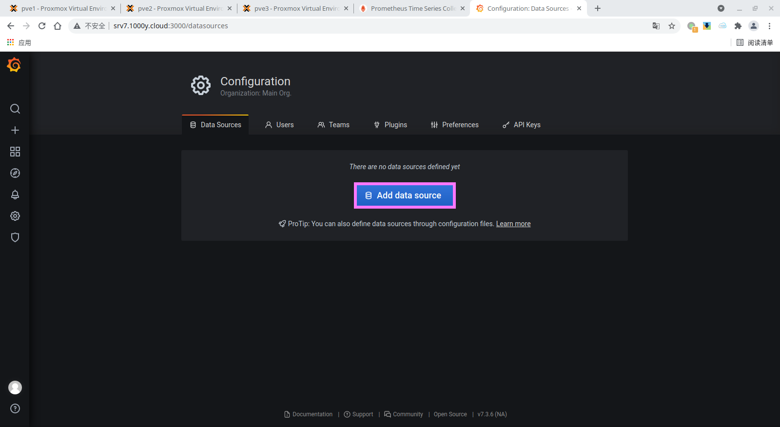 4) 将proxmox-pve-exporter加入至Prometheus [root@srv7 ~]# vim /etc/prometheus/prometheus.yml # 于文档最后追加如下内容 ...... ...... - job_name: "srv7" static_configs: - targets: ['srv7.1000y.cloud:9100']