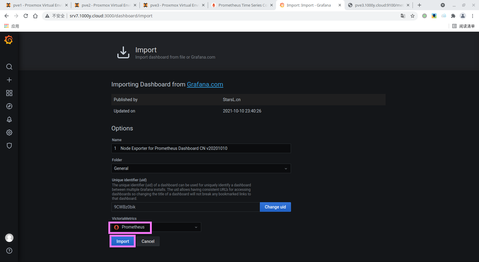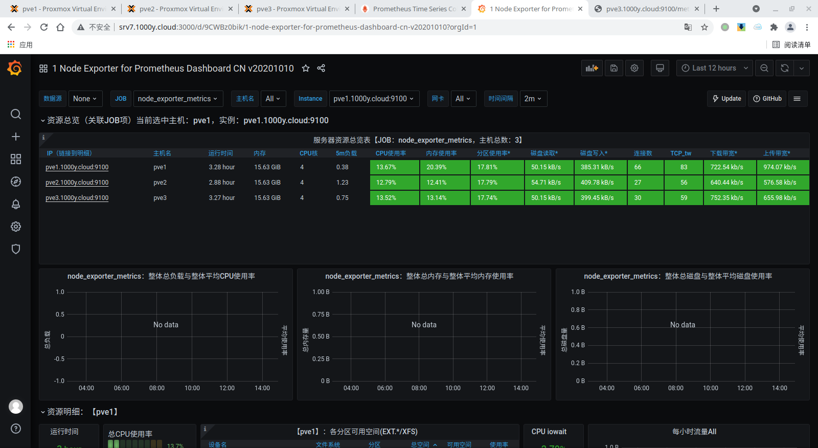 3) 在所有节点上安装node-exporter root@pve1:~# wget -P /tmp https://github.com/prometheus/node_exporter/releases/download/v1.2.2/node_exporter-1.2.2.linux-amd64.tar.gz root@pve1:~# tar -xzvf /tmp/node_exporter-1.2.2.linux-amd64.tar.gz -C /tmp root@pve1:~# mv /tmp/node_exporter-1.2.2.linux-amd64/node_exporter /usr/local/bin/